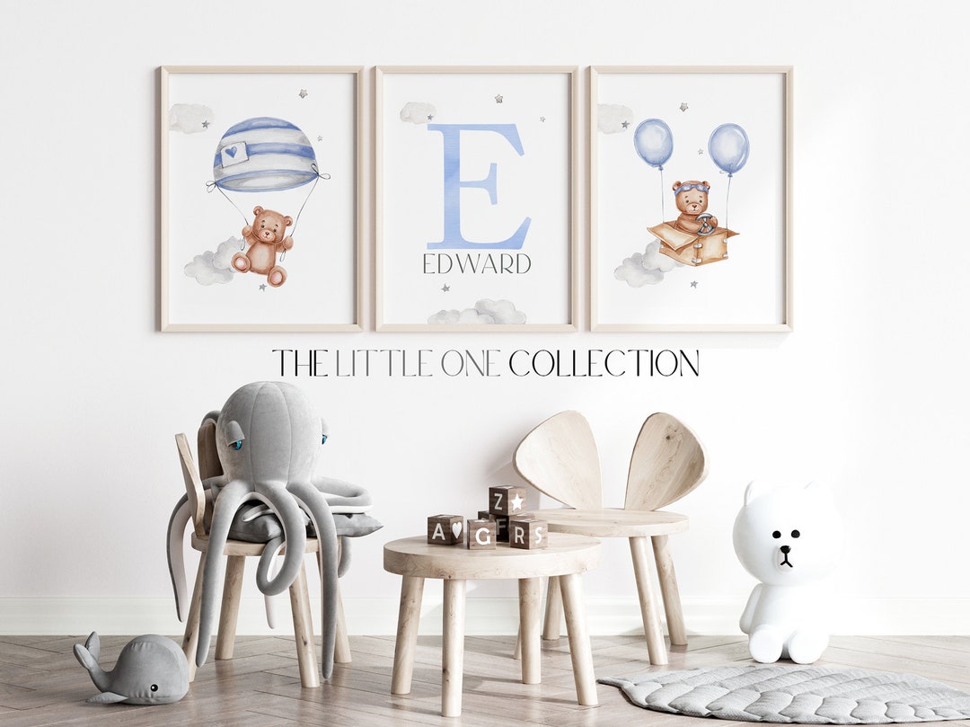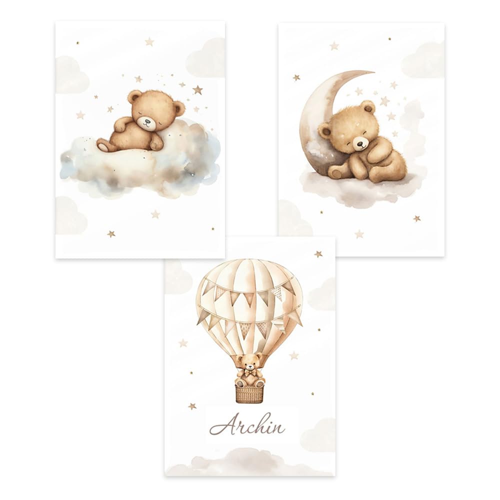 3er Set Babyzimmer Poster - Personalisierte Wandbilder Mit Teddybär, Wolke & Heißluftballon