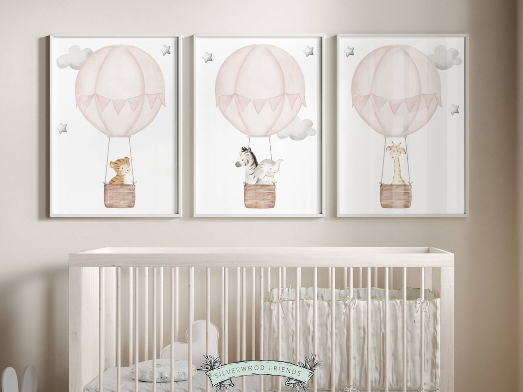 Verzaubere das Kinderzimmer! Dieses 3-teilige Set mit Heißluftballon und Safari-Tieren bringt Farbe und Freude an die Wand. Jeder Druck 20,3x25,4cm auf 350g/m² glänzendem Papier. Einfach in Standard-Rahmen einsetzen. Das niedliche Aquarell-Design begeistert Groß und Klein. Perfekt als Geschenk zur Geburt oder zum Kindergeburtstag. Schaff eine magische Atmosphäre für dein Kind!