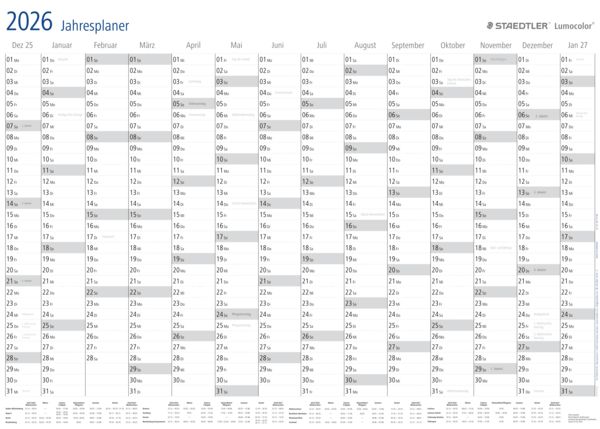 Planst du gerne im Voraus? Dieser Jahresplaner 2026 im DIN A1 Format (84,1x59,4cm) gibt dir den perfekten Überblick über das ganze Jahr! Geliefert wird er gerollt, also ohne lästige Knicke oder Falten - einfach ausrollen, aufhängen und loslegen. Auf hochwertigem 250g Papier gedruckt, ist er beschreibbar mit Kugelschreiber, Filzstift oder Marker, ohne dass was durchdrückt. Alle deutschen Feiertage 2026 sind schon eingetragen, plus Kalenderwochen für ne optimale Terminplanung. Die Monate sind farbig kodiert, sodass du immer sofort siehst, wo du bist. Super vielseitig einsetzbar: Ob im Büro, Homeoffice, in der Küche oder in der WG - dieser Kalender ist ein echter Allrounder! Mit Wochenstart Montag und nem professionellen Design passt er in jede Umgebung. Made in Germany Qualität garantiert ne langlebige und zuverlässige Nutzung. Die lichtbeständigen Farben sorgen dafür, dass der Kalender das ganze Jahr über gut aussieht. Einfach ein muss für jeden, der seine Termine, Projekte und Aktivitäten organisiert halten will. Mit diesem Planer behältst du immer den Überblick und startest bestens vorbereitet ins Jahr 2026!