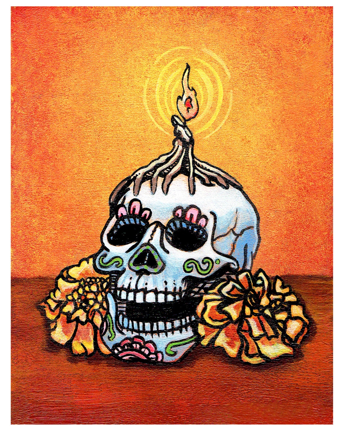 Bring Farbe und mexikanisches Flair in deine vier Wände! Dieses atemberaubende Leinwandbild zeigt bunte Zuckerschädel mit roten Ringelblumen und Kerzen - perfekt für Halloween oder den Tag der Toten.
