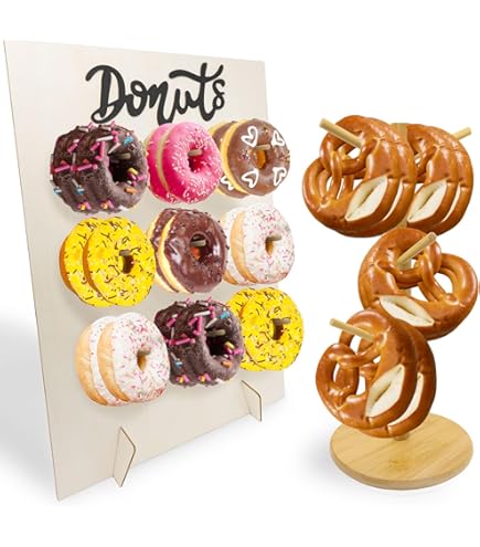 Präsentiere deine Donuts und Bagels wie ein Profi! Diese zwei Acryl-Ständer machen jede Party zum Blickfang. Extra dickes Acryl - stabiler als Glas, aber viel leichter. Einfach an die Wand stellen (inklusive Staffelei-Ständer) und Donuts arrangieren. Leicht zu reinigen, immer wieder verwendbar. Perfekt für Hochzeiten, Geburtstage, Cafés oder Babypartys. Rutschfeste Füße - nichts fällt runter. Deine Gäste werden begeistert sein!