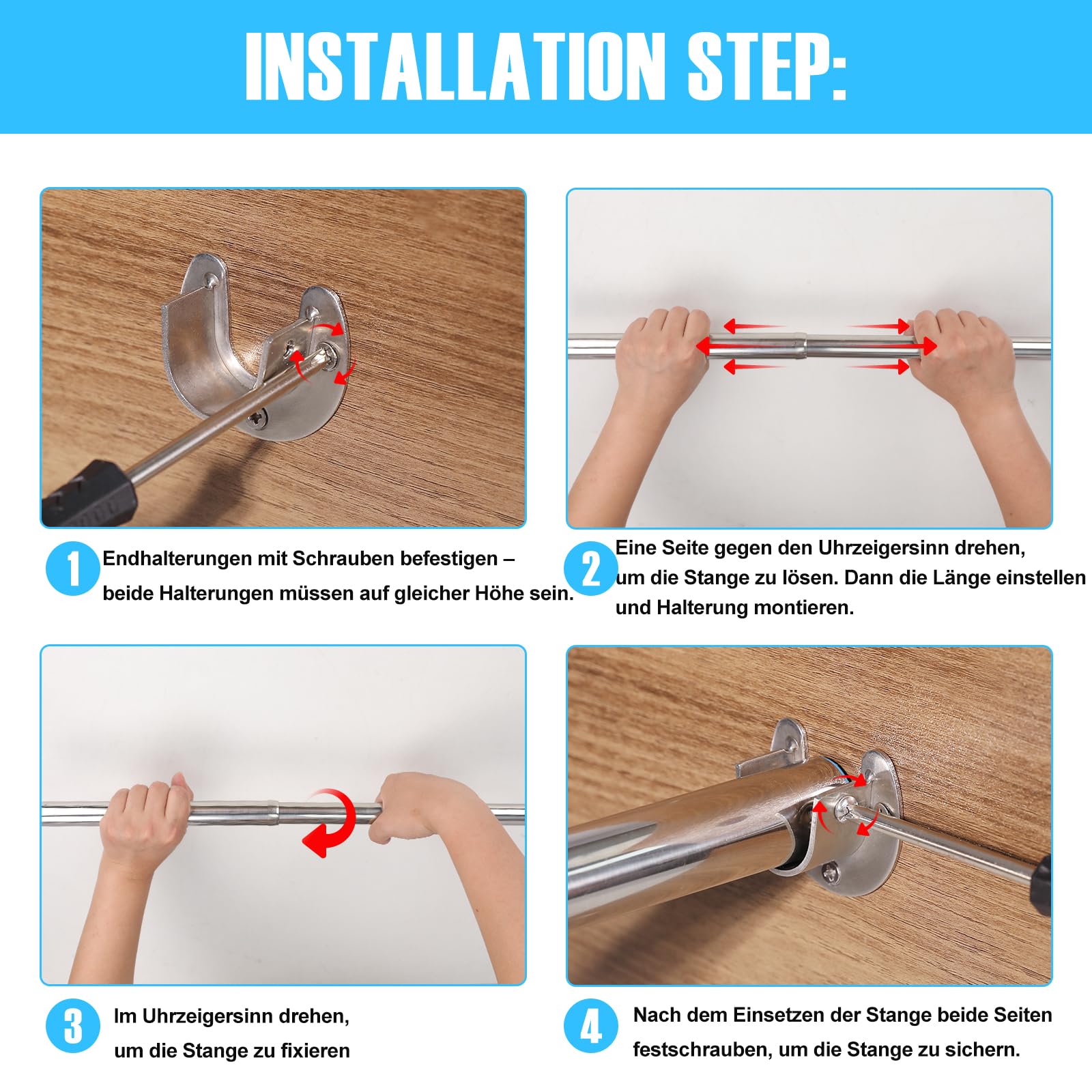 Schluss mit dem Chaos im Schrank! Diese praktische Kleiderstange von Wardlock ist total vielseitig einsetzbar. Aus hochwertigem Edelstahl gefertigt, ist sie rostbeständig und trägt selbst schwere Winterjacken ohne Probleme. Die teleskopierbare Funktion von 69 bis 120cm macht sie perfekt für fast jeden Schrank - einfach ausziehen, bis sie passt! Die U-förmigen Endhalterungen sorgen für maximalen Halt. Im Set enthalten: 1 ausziehbare Stange, 2 Edelstahl-Halterungen und 4 Montageschrauben. Super einfach zu installieren - keine komplizierte Montage nötig. Perfekt nicht nur für Kleiderschränke, sondern auch als Duschvorhangstange, Handtuchhalter im Bad oder sogar als Handlauf. Bring Ordnung in deinen Stauraum - deine Kleidung wird's dir danken!