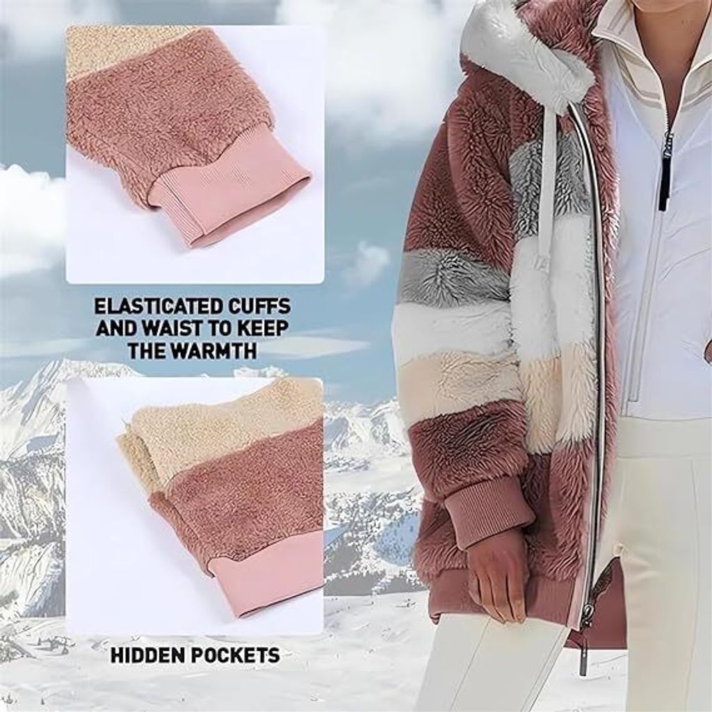 Kuscheliger geht's kaum! Diese trendige Teddy-Fleecejacke von MARIKOO ist dein neuer Liebling für den Winter. Das markante Design kombiniert robustes Gewebe mit super weichem Teddy-Kunstfell an der Vorderseite und der Kapuze - das sieht nicht nur gut aus, sondern hält auch richtig warm. Mit geradem Schnitt und hüftbedeckender Länge bietet sie genug Bewegungsfreiheit für alle Aktivitäten. Der hohe Kragen mit Kinnschutz, die verstellbare Kapuze und der durchgehende Reißverschluss halten kalten Wind zuverlässig draußen. Praktische Außentaschen mit weichem Fleece-Futter wärmen deine Hände, und die elastischen Ärmelbündchen sorgen für perfekten Sitz. Ob zu Jeans, Leggings oder Röcken - diese Jacke passt zu allem und macht jeden Look sofort cooler. In den Größen XS bis 3XL ist für jede Figur die Passende dabei. Einfach bei 30°C waschen und sich auf den nächsten Winter freuen!