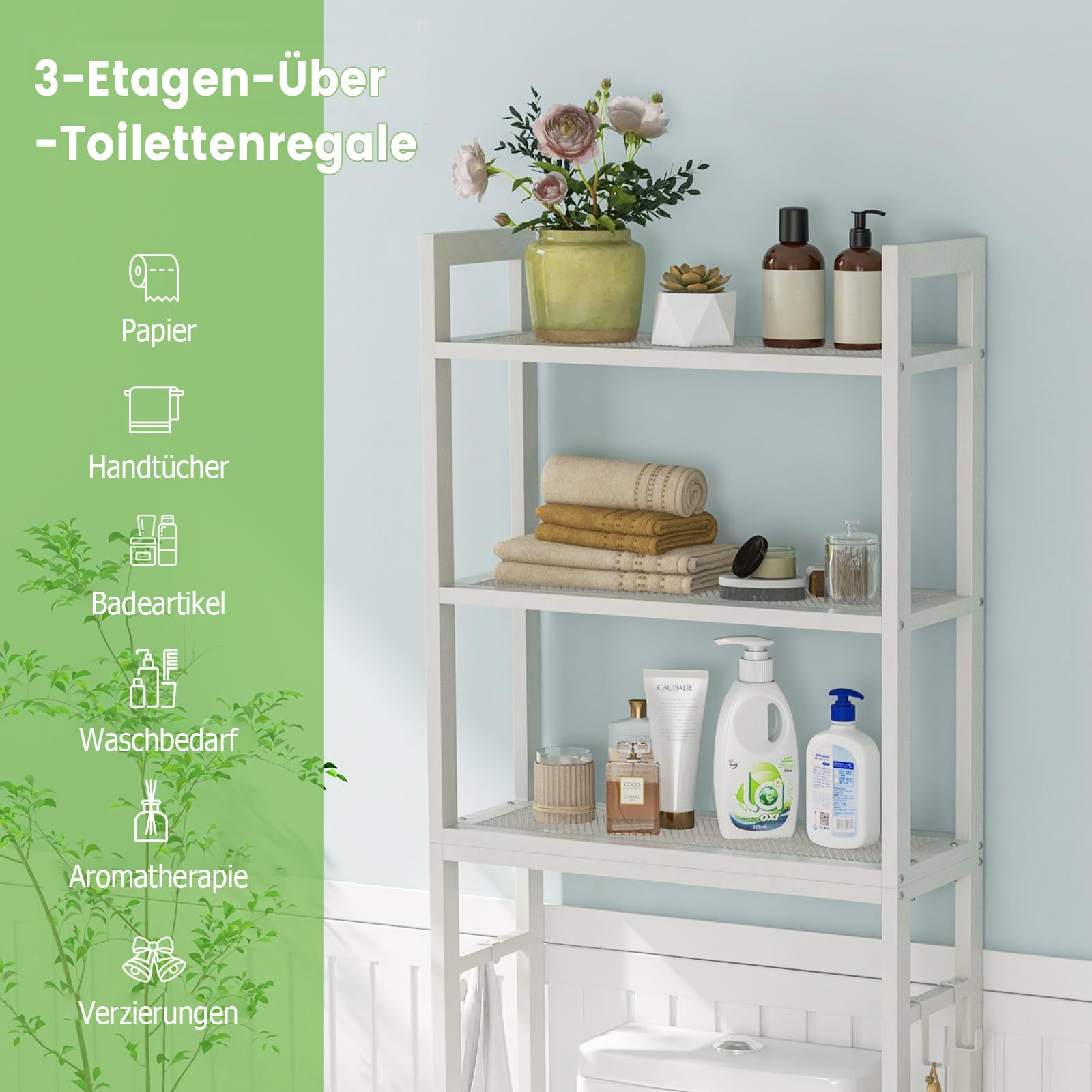 Endlich mehr Stauraum im Bad! Dieses praktische Waschmaschinenregal mit 66x161cm nutzt den Platz über deiner Waschmaschine optimal. Mit 3 stabilen Ablagen für Waschmittel, Weichspüler und Pflegeprodukte. Integrierter Handtuchhalter und 3 Haken für zusätzlichen Stauraum. Aus robustem Edelstahl gefertigt - hält auch schweren Flaschen stand. Einfache Montage ohne Bohren notwendig. Das weiße Design passt zu jedem Badezimmer-Stil. Perfekt für kleine Bäder, wo jeder Zentimeter zählt. Auch als Überbau für die Toilette geeignet. Schafft Ordnung und macht dein Bad sofort aufgeräumter. Ein echter Game-Changer für unordentliche Waschbereiche!