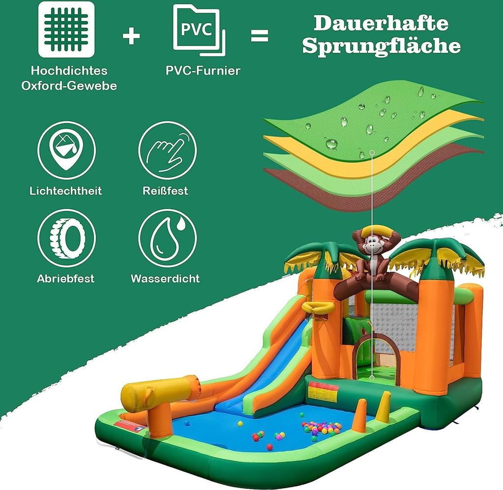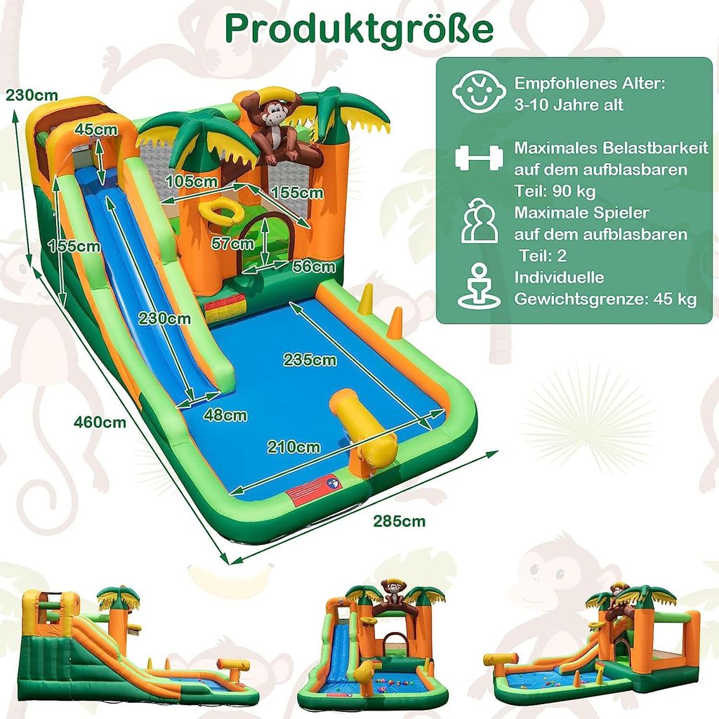 Kinder-Spaß garantiert! Diese mega Hüpfburg ist der Hit für jeden Garten. Mit Rutsche, Wasserbecken, Kletterwand und sogar nem Basketballkorb - hier können sich deine Kids so richtig austoben. Bis zu 3 Kinder gleichzeitig (max. 45kg pro Kind) haben Platz zum Springen und Spielen. Im Sommer wird das Wasserbecken mit Düsen und Wasserpistolen zum absoluten Highlight! Komplett mit Gebläse, Reparaturset und sogar 50 Bällen. Die Sicherheit wird groß geschrieben: mit Schutznetzen und erhöhten Handläufen. Aufbau ist easy - innerhalb von Minuten steht der Spaß parat. Perfektes Geburtstagsgeschenk oder für nen unvergesslichen Sommer!