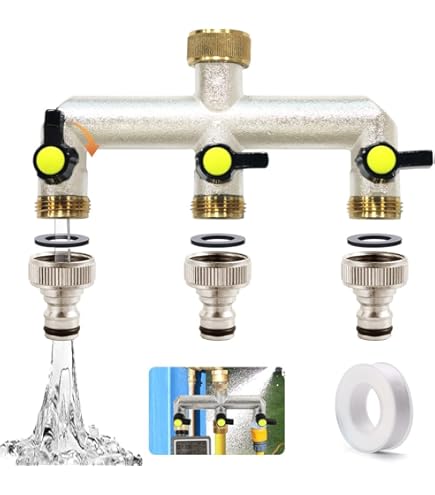 Gartenbesitzer, dieser 3-Wege Wasserverteiler von Votoko macht das Bewässern zum Kinderspiel! Aus massivem Messing gefertigt ist er rostfrei, korrosionsbeständig und hält hohem Druck stand. Mit 3/4 Zoll Innengewinde passt er perfekt auf europäische Wasserhähne. Die drei individuellen Ein/Aus-Kugelhähne ermöglichen dir, mehrere Geräte gleichzeitig zu betreiben - super praktisch! Im Lieferumfang sind drei Adapter von 3/4\ auf 1/2\ enthalten, ideal für Gartenschläuche, Waschmaschinen oder Bewässerungssysteme. Die 360° drehbare Überwurfmutter mit Gummidichtung verhindert lästige Leckagen. Temperaturbeständig von -4°F bis 176°F - perfekt für den Einsatz im Garten, Hof oder in der Garage. Spare Zeit durch simultane Nutzung ohne ständiges Umstecken. Ob du zwei Schläuche parallel bewässern willst oder die Waschmaschine bei der Gartenarbeit laufen lassen möchtest - mit diesem Verteiler klappt's!