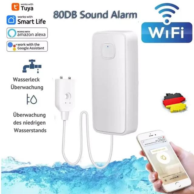 Schütze dein Zuhause vor Wasserschäden mit diesem smarten WLAN-Wassermelder! Bei Kontakt mit Wasser löst er sofort einen 100dB lauten Alarm aus und sendet eine Push-Benachrichtigung auf dein Smartphone. Perfekt für Küche, Bad, Keller oder Waschküche - überall wo Wasserschäden drohen. Die IP66 Wasserschutzklasse macht ihn robust gegen Spritzwasser. Mit der Smart Life App kannst du Szenen erstellen und den Batteriestand überwachen. Die CR2-Batterie hält über 6 Monate. Einfache Installation - einfach positionieren und mit der App verbinden. Kleines Gerät, großer Schutz vor teuren Wasserschäden!
