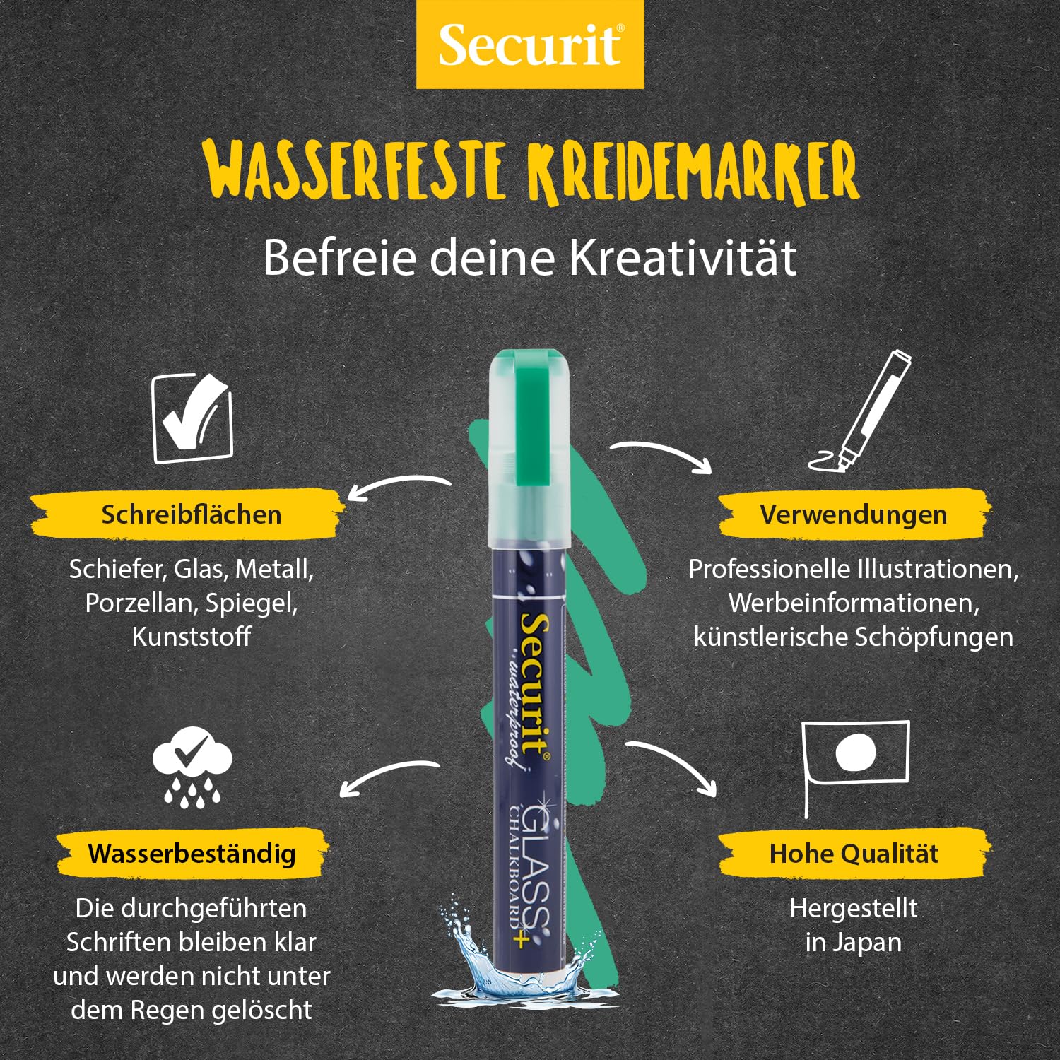 Schreib mal was - und wisch's einfach wieder ab! Diese 4 SECURIT Kreidemarker in Weiß sind perfekt für Tafeln, Glas, Spiegel, Metall und andere glatte Oberflächen. Mit feiner 1-2mm Spitze für präzise Schriftzüge. Einfach schütteln, Spitze drücken und loslegen! Die Tinte ist geruchlos, ungiftig und trocknet schnell. Entfernen geht ratzfatz mit einem feuchten Tuch - keine Kreidereste mehr an den Händen. Hält auch leichtem Regen stand, wenn du draußen schreibst. Seit 1987 bewährt - Profiqualität für Gastronomie, Einzelhandel oder kreative Projekte. Ob Tagesangebote, Begrüßungstafeln oder Dekoration - mit diesen Markern machst du jede Botschaft zum Hingucker!