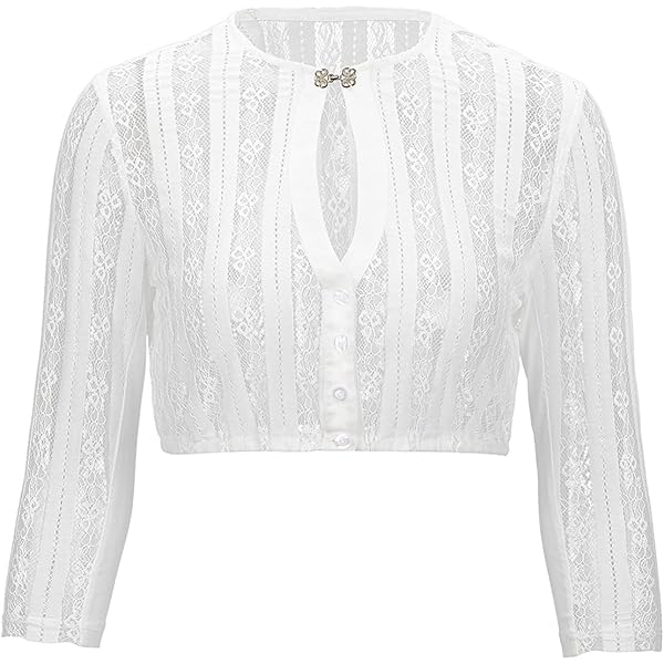 Perfekt fürs Oktoberfest! Diese elegante Dirndlbluse in Weiß mit zarter Spitze ist ein echter Hingucker. Der hochgeschlossene Schnitt mit Langarm ist traditionell und schick zugleich. Das besondere Detail: Das tropfenförmige Lochdesign am Nacken mit Perlenknopf-Verzierung. Aus weichem Spitzenstoff gefertigt, sitzt sie angenehm und sieht unter jedem Dirndl toll aus. Die Größen 34-44 passen für die meisten Figurtypen. Ideal nicht nur für Wiesn, sondern auch für Karneval, Hochzeiten oder andere Feste. Kombinierbar mit verschiedenen Dirndl-Modellen - ob traditionell oder modern. Mit dieser Bluse bist du perfekt gekleidet für jedes Trachten-Event! Einfach anziehen und strahlen!