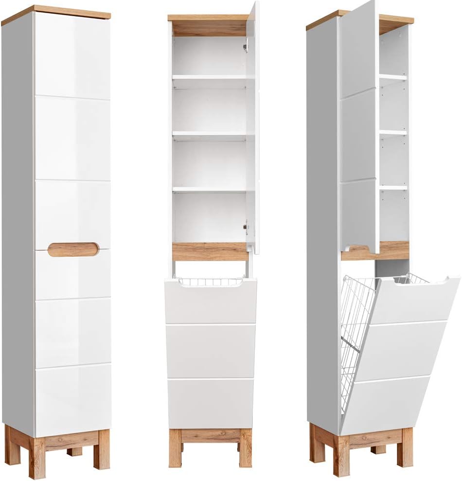 Perfekt für kleine Bäder! Dieser Hängeschrank in Hochglanz weiß mit Wotaneiche-Akzenten bringt Ordnung ins Bad. Mit 35x70x20cm passt er auch in beengte Räume. Die Front ist aus tiefgezogenem MDF in Hochglanz, der Korpus aus melaminbeschichteten Spanplatten in E1-Qualität. Super pflegeleicht und kratzfest! Eine Drehtür mit Dämpfung schließt leise - montierbar rechts oder links. Innen ist ein Einlegeboden für doppelten Stauraum. Das grifflose Design mit Mulden sieht super modern aus! Lieferung erfolgt zerlegt mit bebilderter Anleitung - easy selbst zusammenzubauen. Die hochwertigen Metallscharniere halten lange und die Oberflächen sind unempfindlich gegen Feuchtigkeit. Perfekt für Zahnbürsten, Cremes und alles, was im Bad so rumliegt. Macht dein Bad gleich viel aufgeräumter! Einfach an die Wand montieren und sich über den neuen Stauraum freuen. Sieht aus wie teure Designermöbel, ist aber erschwinglich!