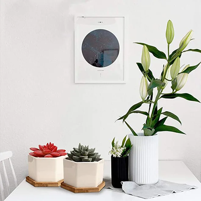 Sukkulenten-Töpfe Set - Weiße Keramik-Pflanztöpfe Mit Bambus-Untersetzer