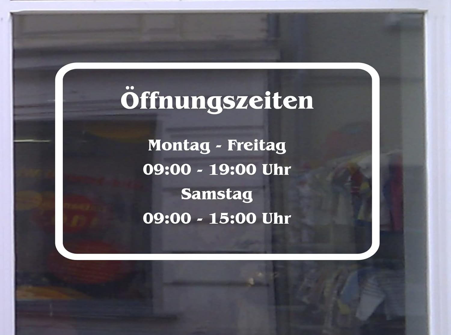 Perfekt für dein Geschäft! Dieser hochwertige Öffnungszeiten-Aufkleber von Don Cappello macht deine Öffnungszeiten gut sichtbar. Die weiße Folie ist 35 cm breit und hat eine glänzende Oberfläche. Du kannst uns bis zu 7 Zeilen mit je 25 Zeichen nennen - wir schneiden sie dann in deiner Wunschschriftart aus! Die Folie hält draußen etwa 3 Jahre, innen fast ewig. Super einfach anzubringen auf Glas, Türen oder anderen glatten Flächen. Wenn du den Aufkleber von innen ans Fenster kleben willst, sagen wir Bescheid - dann schneiden wir ihn spiegelverkehrt. Einfach die gewünschte Breite und Farbe auswählen, deinen Text durchgeben und schon bekommst du deine individuelle Schaufensterbeschriftung!