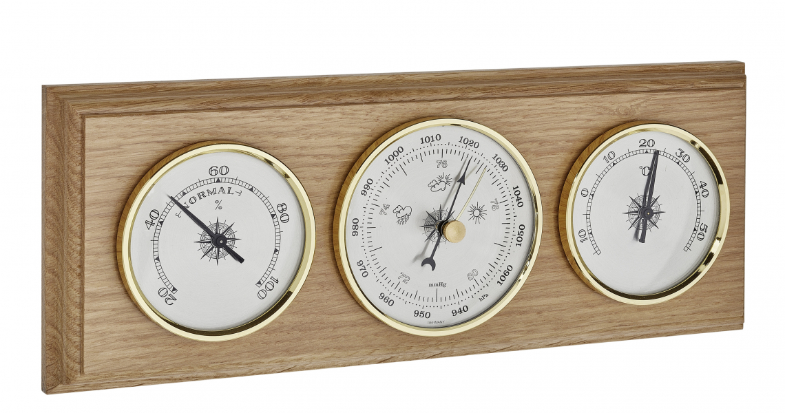 Mit Barometer, Thermometer und Hygrometer in einem Gerät. Perfekt für die Wohnung oder's Büro. Die Maße sind 550 mm x 150 mm bei nem Gewicht von 780 g - steht stabil und fällt nicht so leicht um.
