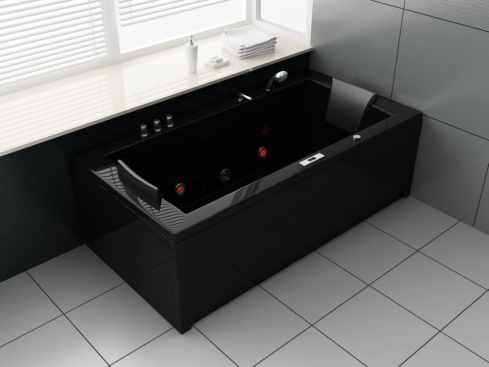 Luxus pur für dein Badezimmer! Der freistehende Jet-Line Whirlpool 'Maggiore II' in Schwarz (1700x800x580mm) bietet Entspannung mit 12 Air-Jet-Massagedüsen, LED-Beleuchtung und 0,35HP-Luftpumpe. Aus hochwertigem Sanitär-Acryl, selbsttragend und mit verstellbaren Füßen. Inkl. Technik, Abfluss mit Überlaufsystem und Schuko-Anschluss (220-240V). Einfache Bedienung, robuste Luftdrucksteuerung. Perfekt für Wellness-Momente – ob allein oder zu zweit!