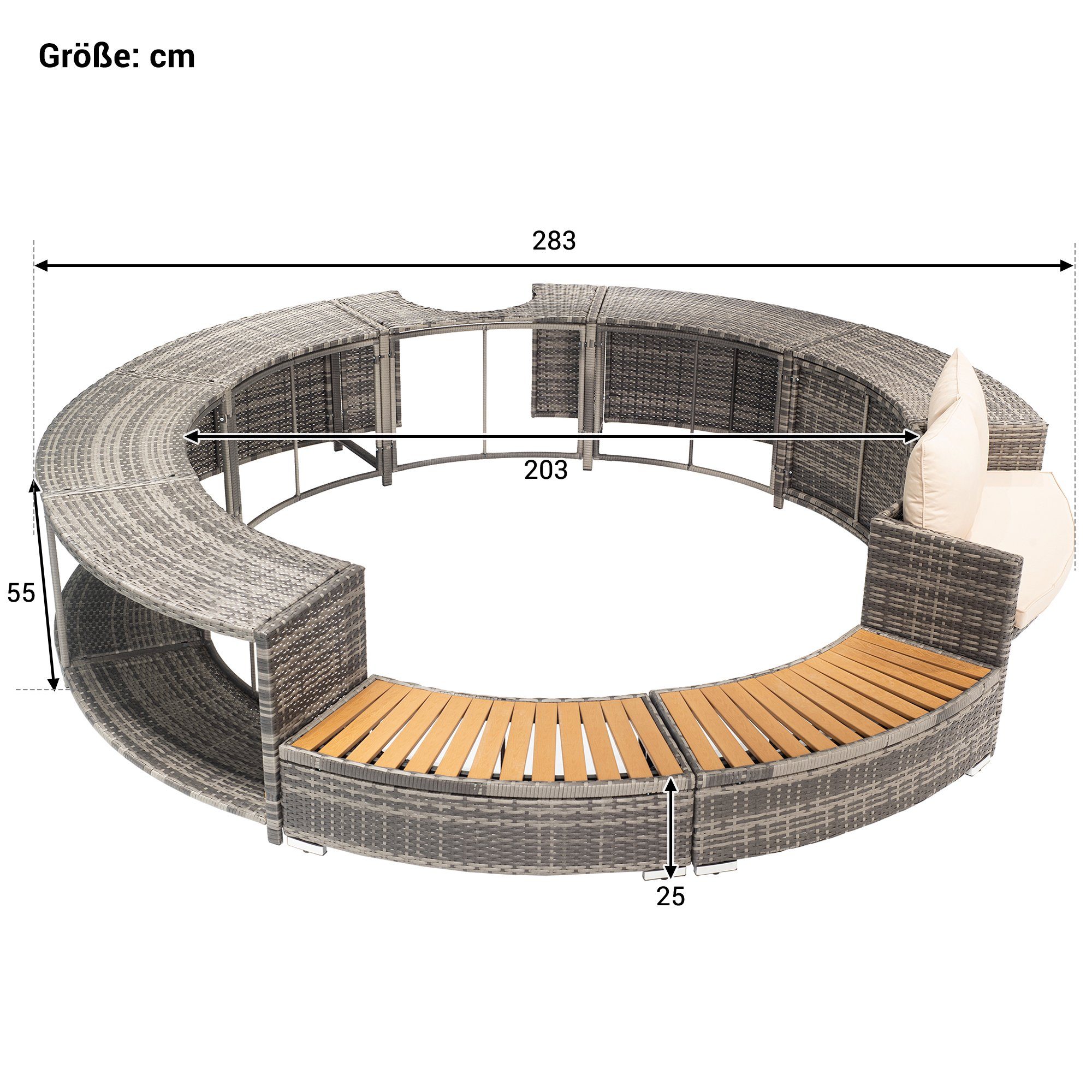 Mann, diese Whirlpool-Umrandung macht deinen Poolbereich zum echten Hingucker! Aus elegantem Poly-Rattan in Grau mit robustem Stahlrahmen und witterungsbeständigem Eukalyptus-Hartholz - das hält wirklich ewig! Das coole Feature: Integrierter Stauraum für alles, was du am Pool brauchst - Handtücher, Sonnencreme, Getränke. Alles griffbereit und ordentlich verstaut. Verleiht deinem Whirlpool ein schickes, modernes Aussehen und schafft einen super funktionalen Bereich. Ob im Garten, auf der Terrasse oder auf dem Balkon - diese Umrandung macht aus deinem Pool eine echte Wohlfühloase. Einfach aufbauen und sich über das upgraded Pool-Erlebnis freuen!