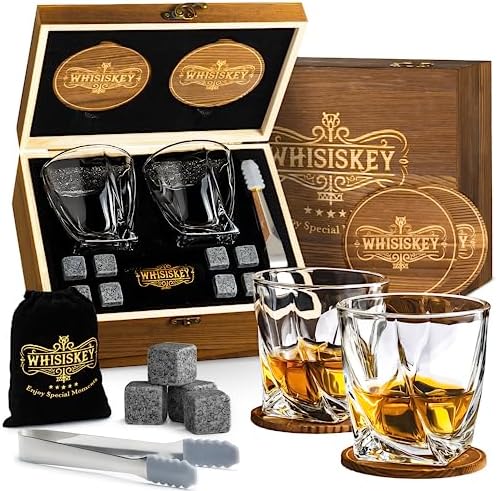 Mixology Whiskey Geschenkset Mit Holzkiste - 2 Whiskey Gläser & 8 Granit Steine | Rustikales Whisky Set Für Männer