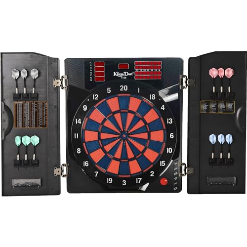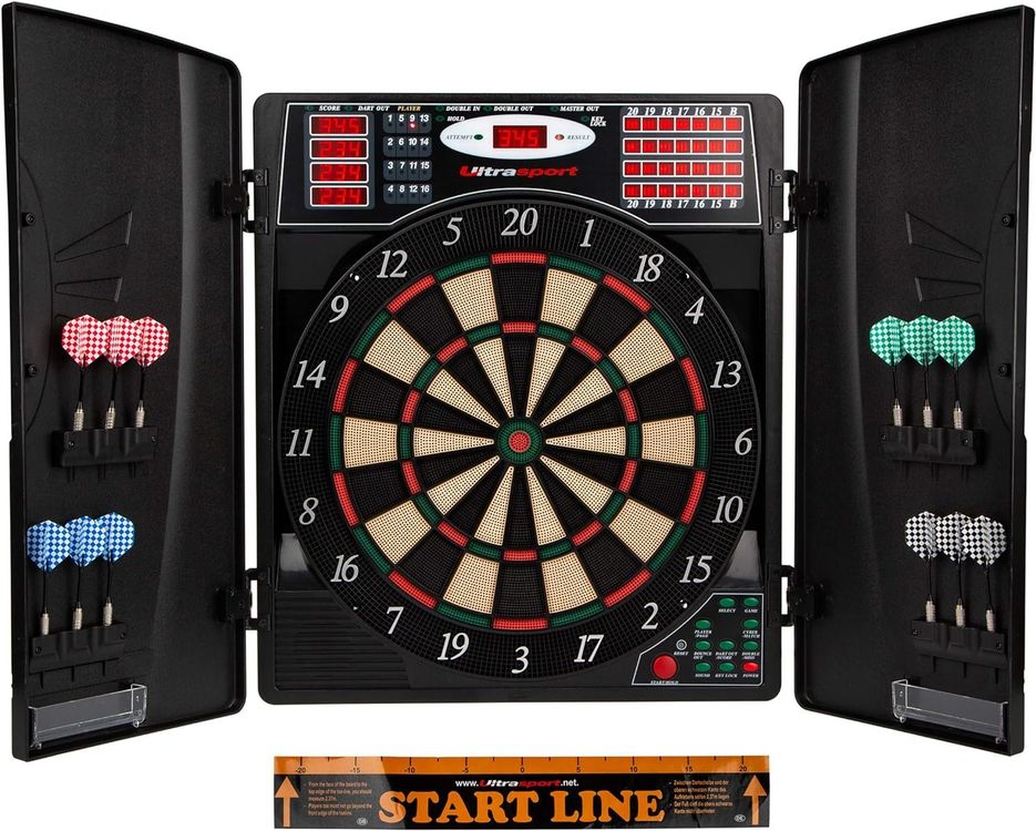 Diese elektronische Dartscheibe von Wiefiche bringt Pub-Feeling nach Hause! Mit 27 Spielkategorien und 243 Unterkategorien ist für jeden was dabei - ob Anfänger oder Profi. Bis zu 16 Spieler können gleichzeitig mitspielen. Das 4-fach LED Display mit hoher Helligkeit zeigt alles gut lesbar an. Sprachansage auf Englisch sorgt für zusätzlichen Spielspaß. Zusammengeklappt nur 50x69cm, ausgeklappt 102x62cm - also platzsparend. Im Lieferumfang: 12 Pfeile, 88 Dartköpfe, Adapter und Anleitung. Perfekt für Büros, Partyräume, Kneipen oder die heimische Garage. Trainiert Sehkraft, Armstärke und Konzentration. Einfache Bedienung - einfach Strom anschließen und los geht's! Mach deine nächste Party zum unvergesslichen Event!