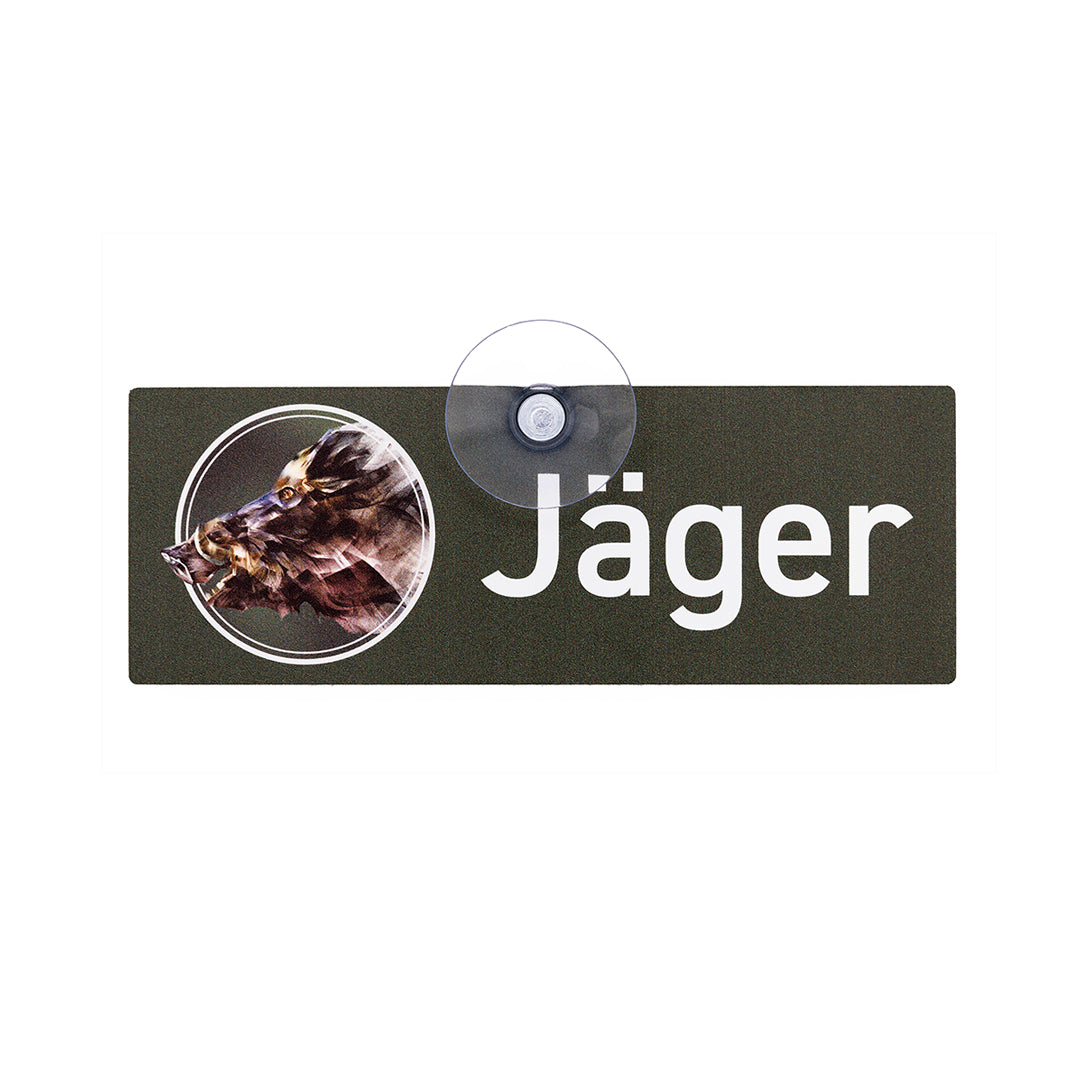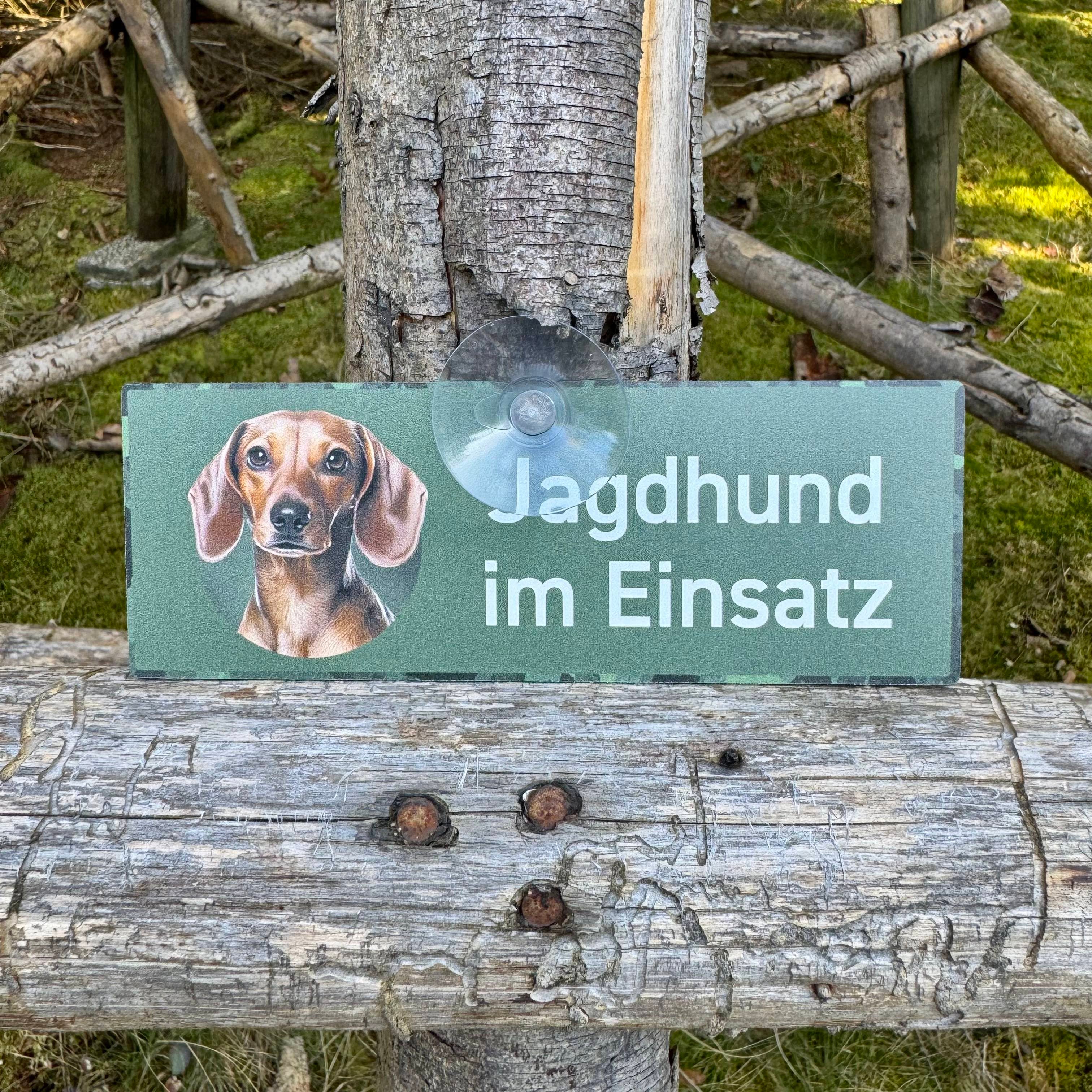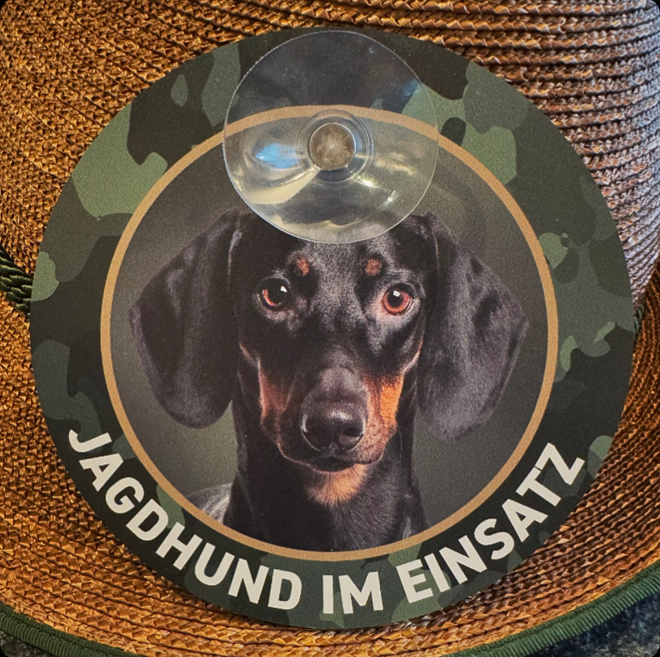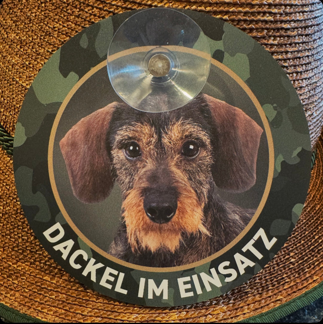 Oh wie süß! Dieses Dackel-Schild für die Auto-Scheibe ist einfach nur lustig. \Dackel im Einsatz\ - da weiß jeder gleich, wer hier mitfährt!\n\nAus hochwertigem Aluminium-Verbundmaterial, beidseitig bedruckt. Hält auch direkter Sonne und Hitze stand ohne sich zu verziehen. Und der Saugnapf (40mm, Made in Germany) hält bombenfest - kein Klappern, kein Runterfallen!\n\n13 cm Durchmesser - genau die richtige Größe um gesehen zu werden, ohne zu stören. UV- und witterungsbeständig, also lange Freude daran.\n\nEinfach an der Scheibe anbringen (aber bitte nicht im Sichtfeld!), Position bei Bedarf wechseln oder ganz abnehmen. Super praktisch!\n\nPerfect für:\n• Dackel-Besitzer\n• Teckel-Fans\n• Jagd-Fahrzeuge\n• Als Geschenk für Hundeliebhaber\n• Auto-Dekoration\n\nDas Design ist einfach klasse - der Rauhaardackel sieht so lebensecht aus! Ein echter Hingucker auf jedem Parkplatz. Und weil's von Wilde Hilde kommt, weißt du dass die Qualität stimmt.