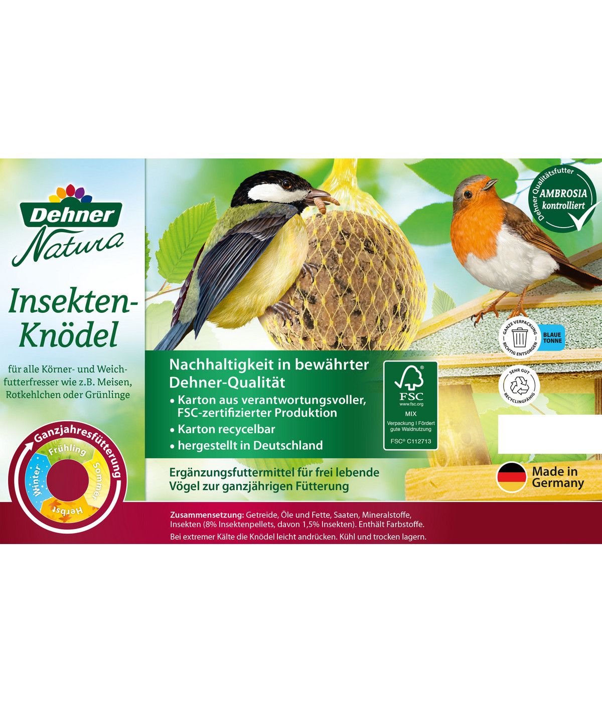 Unterstütze unsere heimischen Vögel! Dieses Dehner Natura Wildvogelfutter bietet beste Qualität für Meisen, Rotkehlchen, Grünlinge und mehr. 5 Packungen mit je 3 Futterstangen - insgesamt 1050g voller Sonnenblumenkerne, Hanfsaat und Erdnusskerne. Im praktischen Netz zum einfachen Aufhängen an Bäumen oder Balkonen. Zur Ganzjahresfütterung geeignet - denn unsere Vögel brauchen auch außerhalb des Winters Unterstützung. Hergestellt aus natürlichen Rohstoffen, ohne künstliche Zusätze. Hilf mit, die vielfältige Vogelwelt zu erhalten! Einfach aufhängen und den gefiederten Freunden eine Freude machen. Qualität aus jahrzehntelanger Expertise - darauf kannst du vertrauen!
