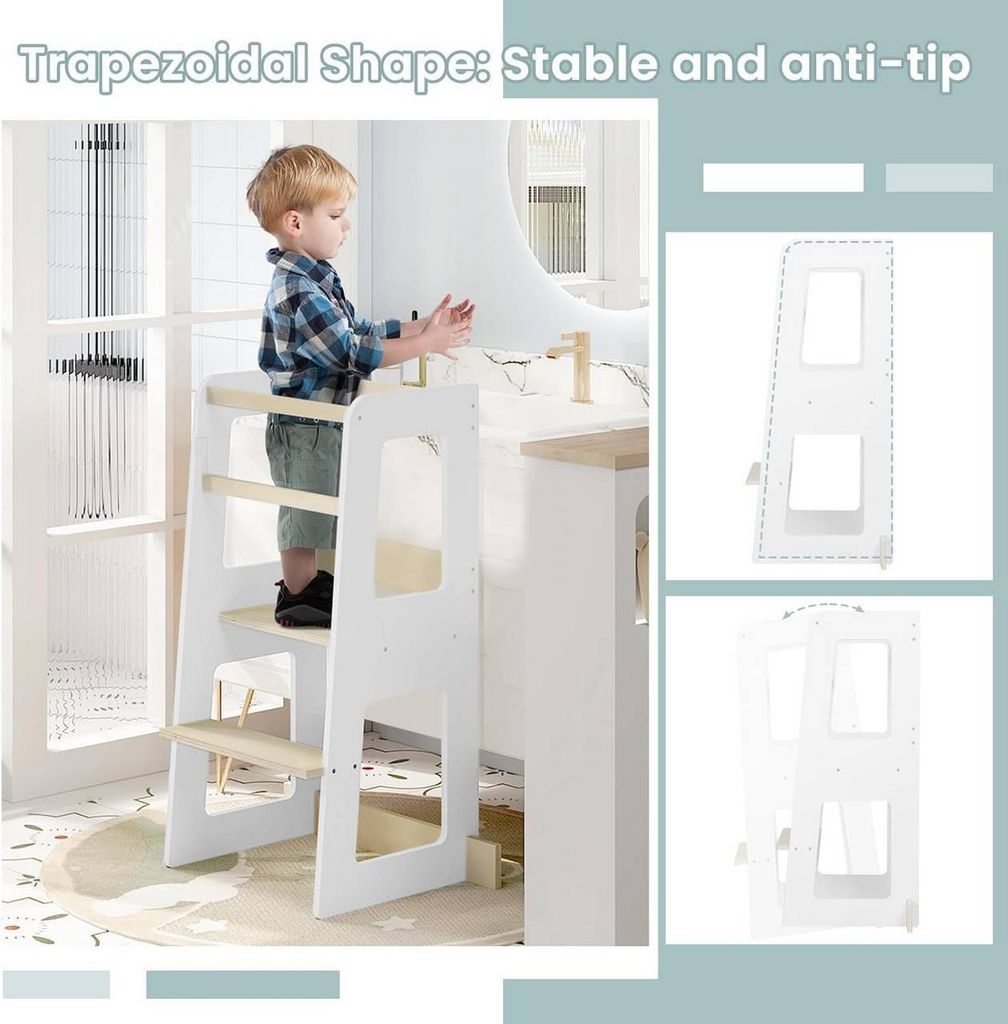 Der Lernturm macht dein Kind zum kleinen Helfer in der Küche! Aus stabilem Bambus, 90cm hoch mit 46x46cm Standfläche. A-förmiges Design für maximalen Stand. Mit Sicherheitsgeländer und zwei Stangen - dein Kind ist rundum geschützt. Fördert die motorische Entwicklung durch eigenständiges Klettern. Dein Kind kann jetzt bei der Essenszubereitung zuschauen und helfen. Mehr Selbstständigkeit und Teilnahme am Familienleben. Robuste Konstruktion, hält auch wildem Herumtoben stand. Einfach aufstellen und dein Kind hat eine ganz neue Perspektive!