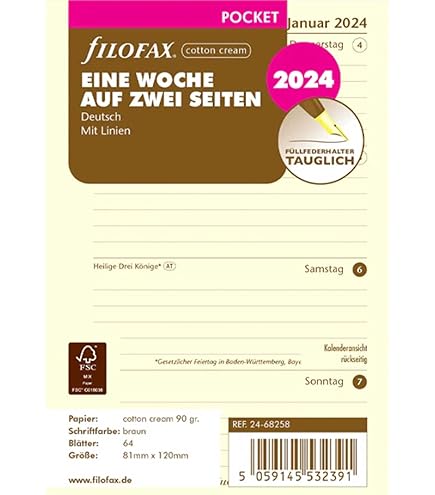 Organisation to go! Dieser Filofax Pocket Kalender passt perfekt in deine Tasche und hilft dir, den Überblick zu behalten. Produktdetails: • Format: Pocket • Aufteilung: 1 Woche auf 2 Seiten • Sprache: Deutsch • Serie: Professional • Für Jahr 2023 Besonderheiten: • Übersichtliche Wochenplanung • Perfekt für unterwegs • Passt in alle Filofax Pocket Organizer • Hochwertiges Papier • Elegantes Design Ideal für: • Geschäftsleute • Studenten • Vielbeschäftigte • Reisende • Alle die Ordnung lieben Der Kalender bietet viel Platz für Termine, Notizen und To-Do's. So vergisst du nichts Wichtiges mehr - ob im Job oder privat. Hol dir jetzt die perfekte Organisation für deine Tasche!