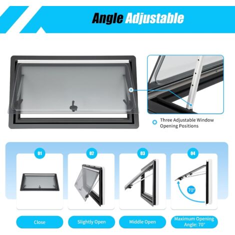 Mehr Komfort für dein Wohnmobil! Dieses Ausstellfenster (50x30 cm Einbau) besteht aus Aluminiumlegierung, ABS und gehärtetem Glas - stabil und witterungsbeständig. Integriertes Fliegengitter hält Insekten draußen, das Rollo schafft Privatsphäre und schützt vor Sonne (18% Lichtdurchlässigkeit). Öffnet sich bis 85° und lässt sich in verschiedenen Positionen arretieren. Einfach zu montieren - passt für Wohnmobile, Wohnwagen, Vans und Boote mit 30-40 mm Wandstärke. Mit allen Montageteilen im Lieferumfang. So wird dein Fahrzeug noch wohnlicher! Perfekt für frische Luft ohne lästige Mücken.