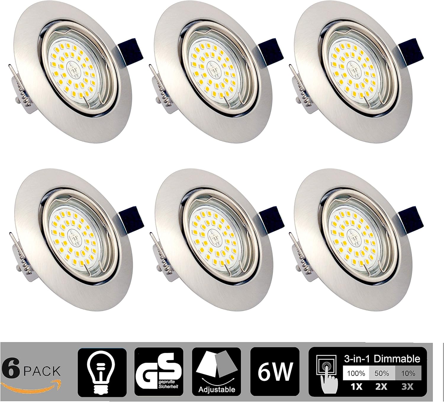 Diese LED Spots von wowatt sind die perfekte Beleuchtung für dein Zuhause! 6 Stück im Set, alle dimmbar und mit 3 Farbtemperaturen - da findest du garantiert die richtige Stimmung.\\n\\nDie Highlights im Überblick:\\n- 3 Lichtfarben: Warmweiß (3000K), Neutralweiß (4000K), Kaltweiß (6000K)\\n- 3-stufig dimmbar per normalem Schalter: 100%, 50%, 10%\\n- IP44 - geschützt gegen Spritzwasser für Bad & Küche\\n- Ultraflach nur 30 mm - passt auch in niedrige Decken\\n- Schwenkbar um 30° für flexibles Licht\\n\\nEgal ob du gemütliches Licht im Wohnzimmer brauchst, helles Arbeitslicht in der Küche oder funktionale Beleuchtung im Bad - diese Spots machen alles mit. Einfach per Schalter die Helligkeit und Farbe wechseln, kein teurer Dimmer nötig. Und mit 30.000 Stunden Lebensdauer und 90% Energieersparnis schonst du auch noch deinen Geldbeutel!