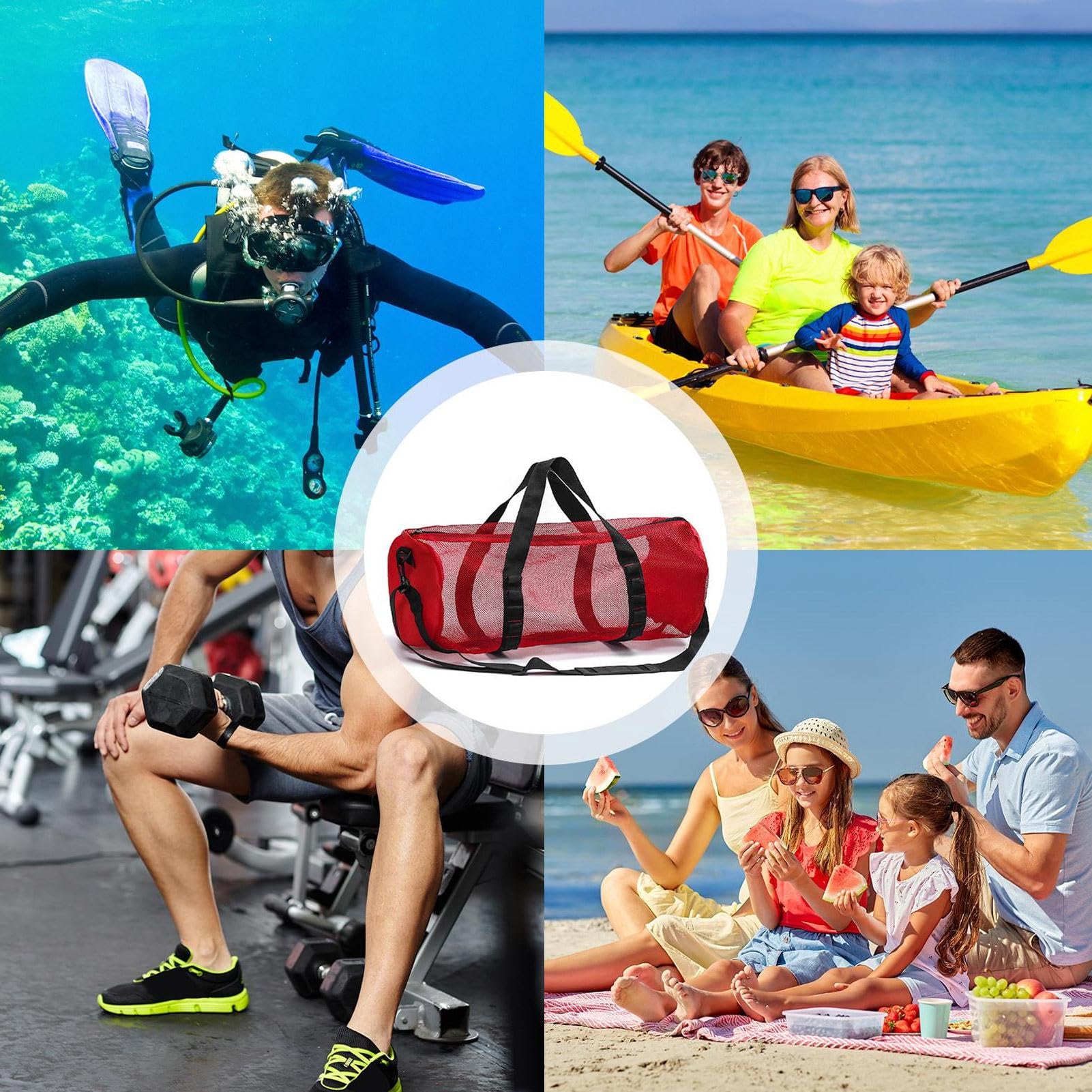 Endlich eine Tasche, die all deine Tauch- und Schnorchelausrüstung vernünftig verstaut! Diese extra große Netztasche ist dein perfekter Begleiter für jeden Strandtag. 🏖️\n\nMaterial und Features:\n• Robustes Nylon-Netzgewebe\n• Verdicktes wasserdichtes Innenfutter\n• Starker Reißverschluss\n• Auffällige rot-weiße Streifen\n• Faltbares Design\n\nDas bietet sie dir:\n• Riesigen Stauraum für alle Ausrüstung\n• Schnelles Trocknen durch Netzmaterial\n• Gute Sichtbarkeit im Wasser\n• Einfaches Packen und Verstauen\n\nIdeal für:\n• Tauchausflüge\n• Schnorcheltouren\n• Strandtage\n• Wassersport\n\nEgal ob Flossen, Maske oder Schnorchel - hier findet alles Platz! Und nach dem Einsatz einfach zusammenfalten und wegpacken. So macht Wassersport Spaß! 🌊
