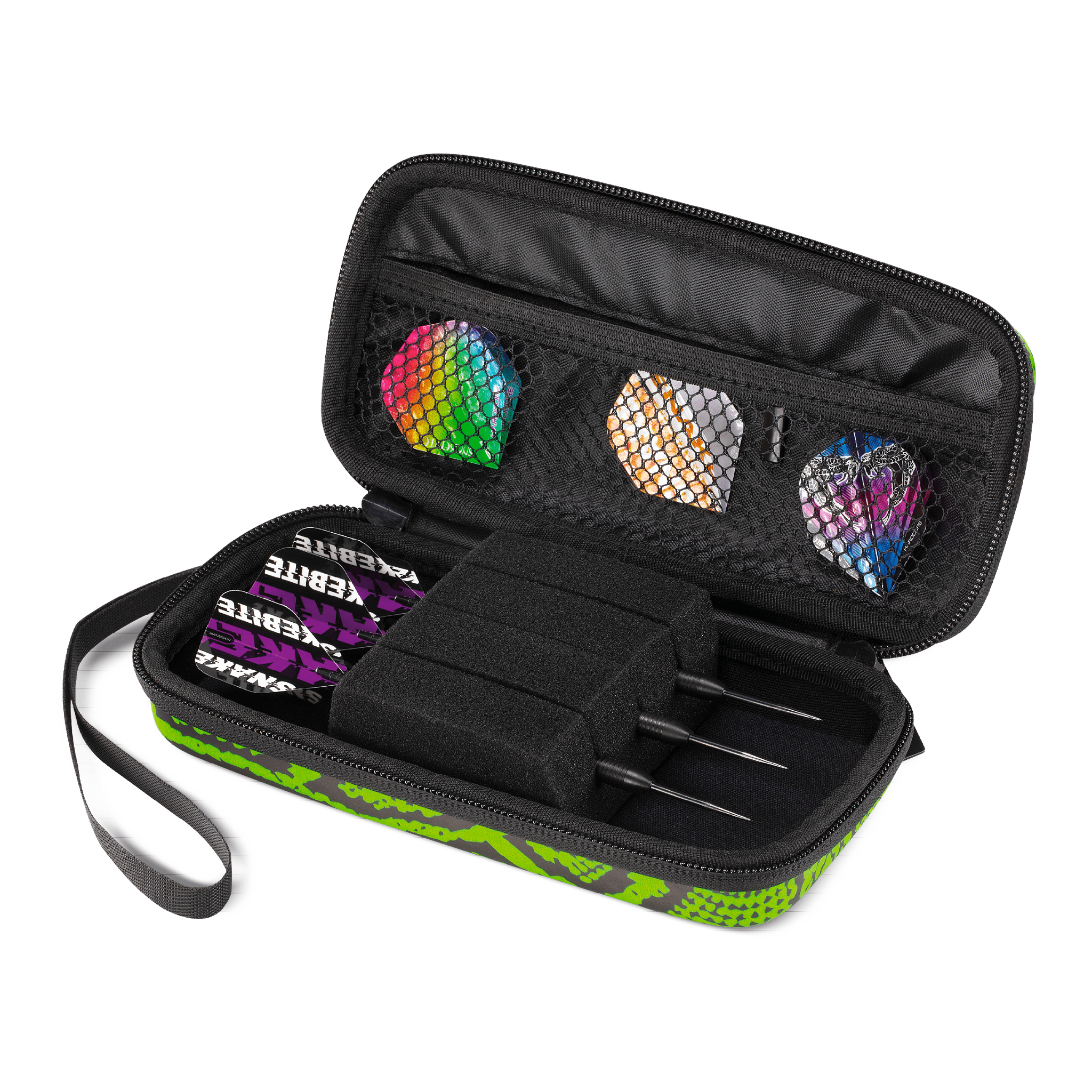 Professionelles Dart-Zubehör vom Weltmeister! Diese Snakebite Trifold Dart Brieftasche wurde in Zusammenarbeit mit Peter Wright entwickelt und erfüllt alle Anforderungen ambitionierter Dartspieler. Hergestellt aus leichtem Verbundwerkstoff ist sie robust und doch leicht. Mit den Maßen 190x150x20mm bietet sie genug Platz für dein komplettes Dart-Equipment. Acht praktische Slots für Wellen und Flights sorgen für Ordnung. In der Tasche findest du Platz für ein komplettes Dart-Set. Das auffällige blaue/gelbe Design mit dem Snakebite-Logo ist ein echter Hingucker. Perfekt für Training, Liga oder Turniere. Ob Anfänger oder Profi - mit dieser Tasche bist du immer bestens organisiert. Inhalt nicht enthalten - aber dafür hast du ja hoffentlich schon deine Lieblingsdarts! Mach dein Spiel komplett mit diesem qualitativ hochwertigen Zubehör.