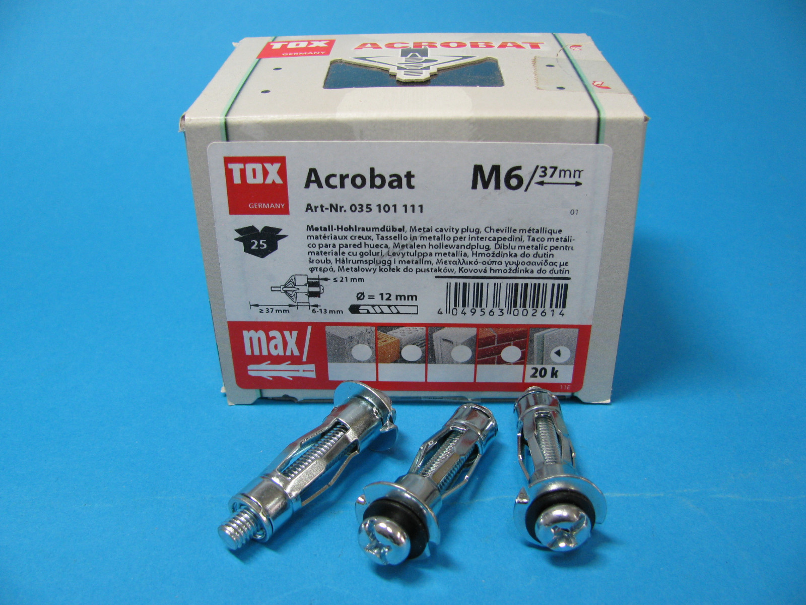 Endlich stabil befestigen auch in Gipskartonwänden! Diese TOX Metall-Hohlraumdübel Acrobat M8 x 55 mm sind einfach genial. Verzinkt und mit metrischer Schraube - das hält wirklich was aus! Perfekt für Befestigungen in Gipskartonplatten und bei geringen Hohlraumtiefen. Die Dübelkappe mit Drehsicherung verhindert lästiges Mitdrehen im Baustoff, und die Spreizsegmente legen sich großflächig auf die Plattenrückseite - mega stabil! Ob einlagige oder zweilagige Wandplatten - damit klappt's problemlos. Die Verarbeitung geht ratzfatz, am besten mit der TOX-Montagezange, aber auch mit Akkuschrauber oder Schraubendreher möglich. Wichtig: Immer den angegebenen Bohrer-Ø beachten und Mindesthohlraumtiefe sowie Plattendicke checken. Das Bohrloch in Gipskarton machst du am besten mit nem Holz- oder Metallbohrer. Im Blister sind 3x2 Stück also insgesamt 6 Dübel dabei - mehr als genug für dein nächstes DIY-Projekt!