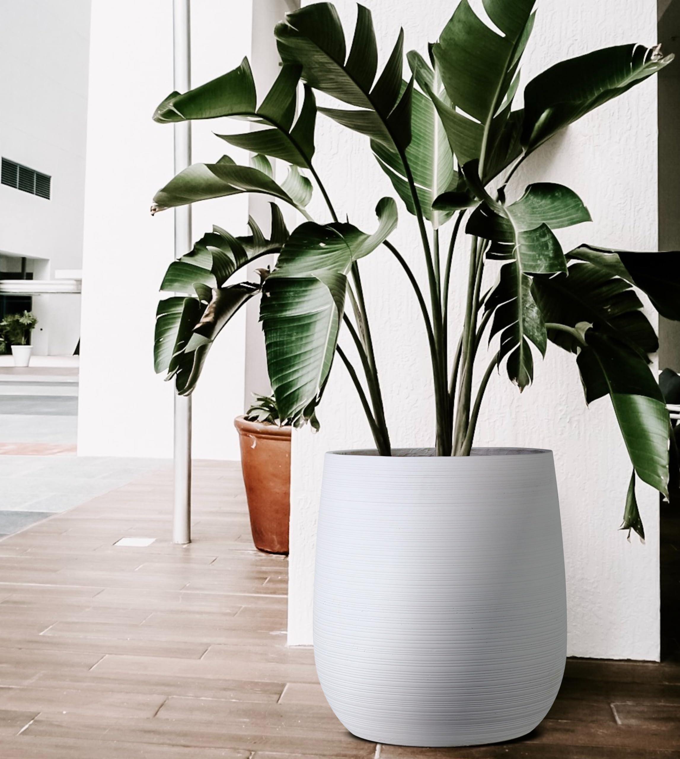 Dieser Blumentopf ist ein echter Hingucker! Der Olly & Rose XL Pflanzkübel in mattweiß mit schicken Hartholzbeinen misst 38cm Durchmesser und 53cm Höhe (inkl. Beine). Aus robustem Keramikfaserzement - wetterfest für draußen und stylisch für innen. UV- und frostbeständig, mit Drainageloch und Stopfen. Die geschwungene Form macht jede Pflanze zum Dekorations-Highlight. Perfekt für Wohnzimmer, Terrasse oder Eingangsbereich. Ob für große Zimmerpflanzen oder bunte Blumenarrangements - dieser Kübel setzt Akzente. Ein Statement-Piece das Modernität und Natur verbindet. Einfach bepflanzen und dein Zuhause aufwerten!