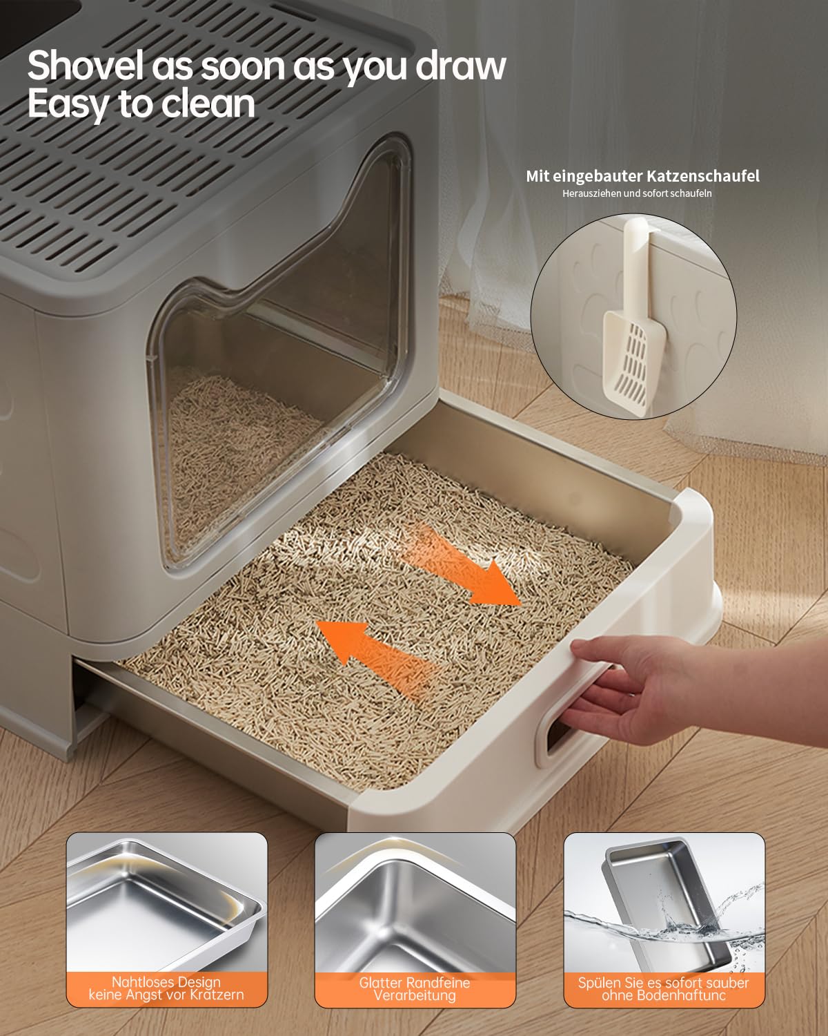 Dieses geschlossene Katzenklo ist der Traum für jede Katze und jeden Katzenbesitzer! Extra groß dimensioniert - perfekt für Katzen bis 15 kg. Mit cleverem Randdamm-Design und doppelter Dichtung, sodass nichts daneben geht. Die ausziehbare Edelstahl-Schublade macht die Reinigung super einfach - kein Gefummel mehr! Zwei Aktivkohlefilter im Deckel sorgen für geruchsneutrale Luft - deine Wohnung rieft nicht mehr nach Katzenklo. Besonders praktisch: Der tiefe Einstieg ist auch für Kitten und ältere Katzen kein Problem. Mit 30 Litern Volumen musst du das Streu seltener wechseln. Aus kratzfestem Edelstahl gefertigt - säureresistent und easy zu reinigen. Im Lieferumfang sind alles dabei: Antirutschmatte, Schaufel und Reinigungsbürste. In wenigen Minuten zusammengebaut und schon einsatzbereit. Deine Katze wird es lieben - und du erst! Endlich ein Katzenklo, das wirklich hält, was es verspricht. Einfach ausprobieren und den Unterschied erleben!