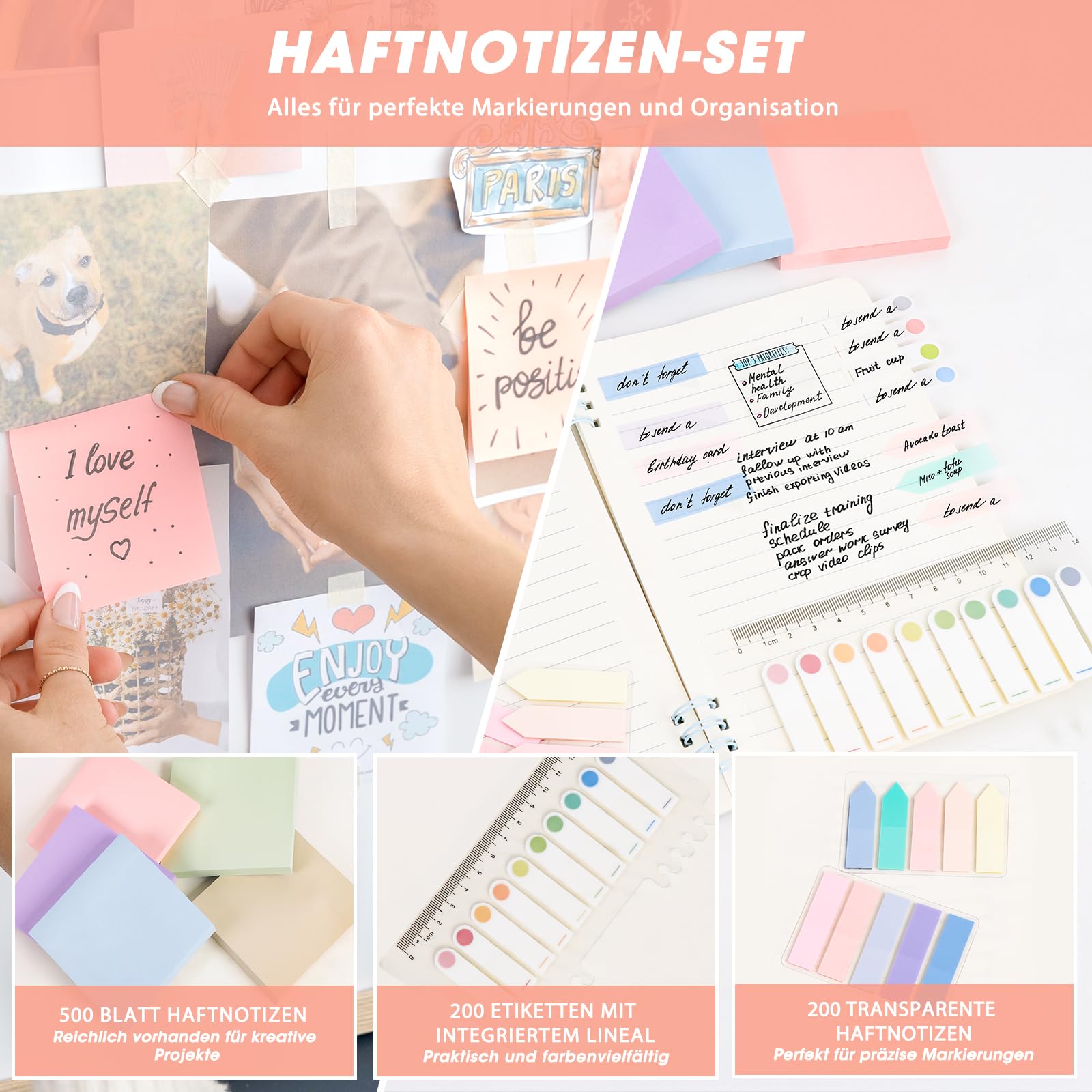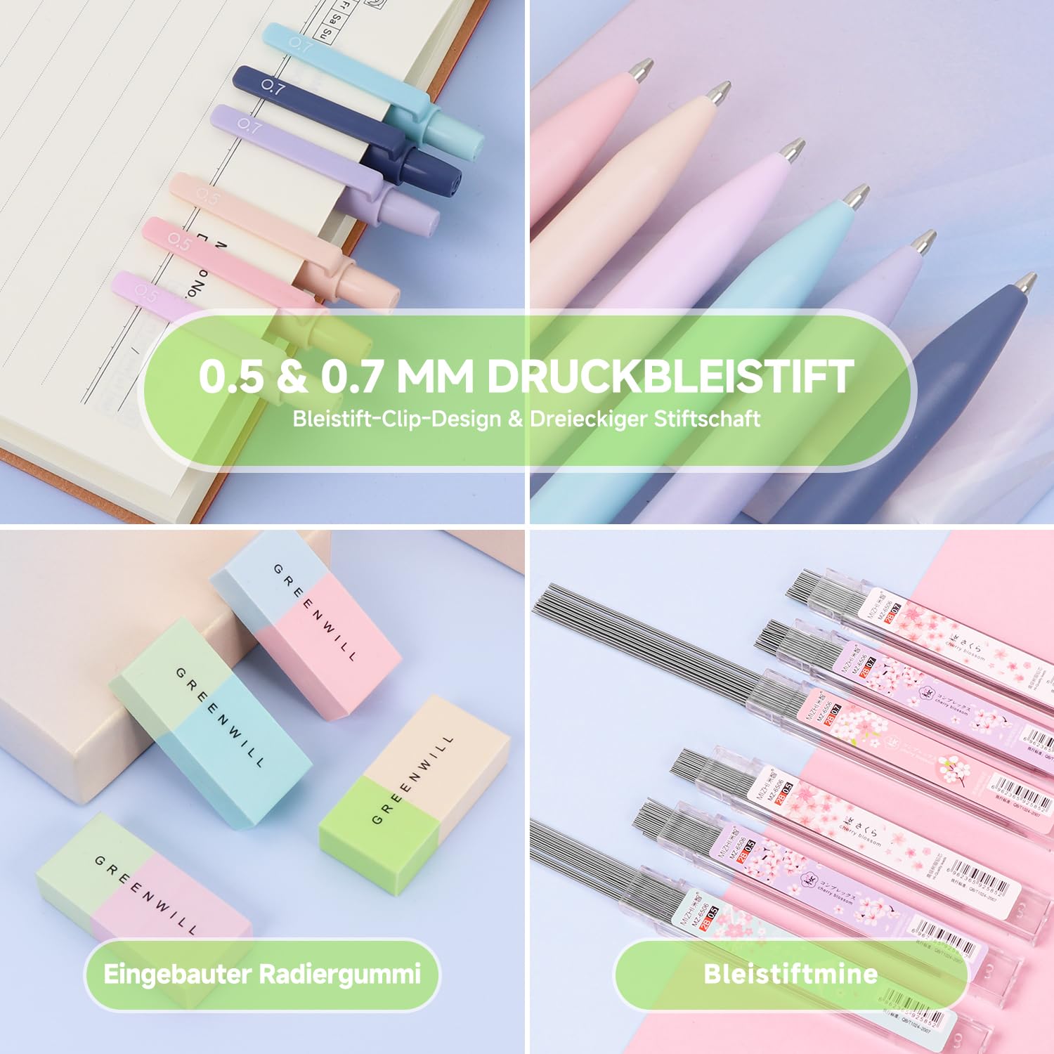 Alles für die Schule in einem Set! 69 Teile im hübschen Pastell-Design. Enthält: 12 Textmarker, 6 Druckbleistifte, 6 Doppellinienstifte, 6 farbige Gelschreiber + Nachfüllungen, 5 schwarze Gelschreiber + Nachfüllungen, 4 Jelly-Radierer, 8 Haftnotizen, 6 Minen-Nachfüllungen, Büroklammern. Die Textmarker mit meißelförmiger Spitze - perfekt für breites Markieren und feines Unterstreichen. Druckbleistifte in 0,5mm und 0,7mm mit ergonomischem Dreikantgriff. Alles super organisiert und sofort einsatzbereit. Perfekt für Schule, Studium, Büro oder kreative Projekte. Macht Lernen und Organisieren zum Spaß! Alles dabei, was man braucht - einfach auspacken und loslegen!