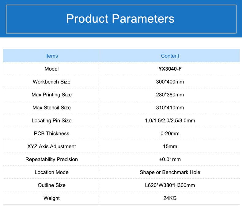 Hey, für alle Elektronik-Bastler und Profis: Dieser YX3040-F Schablonendrucker ist genau das Richtige für präzises Arbeiten! Mit 300x400mm Arbeitsbereich perfekt für Leiterplatten - ob einfach oder doppelseitig. Die stabile Wabenmuster-Aluminiumplatte und die verschweißte Stahlbasis sorgen für absolute Präzision und Langlebigkeit. Die Positionierung mit Stiften und festen Platten macht das Ganze super einfach und wiederholbar. Und das Beste: Die Registrierungseinstellung mit X- und Y-Achsen-Feinabstimmung ist echt easy zu handhaben! Die spiralförmige Höhenverstellung passt sich verschiedenen Leiterplatten-Stärken an. Rahmenlose Siebdrucke werden sicher mit Klemmen fixiert - mit Knöpfen schnell und fest einzurichten. Im Lieferumfang sind übrigens alle wichtigen Teile dabei: Positionierstifte in verschiedenen Größen, Kupfer-Pins, Fixierungen und sogar Spatel und Schaber. Perfekt für deine Elektronik-Projekte - ob Hobby oder Profession!