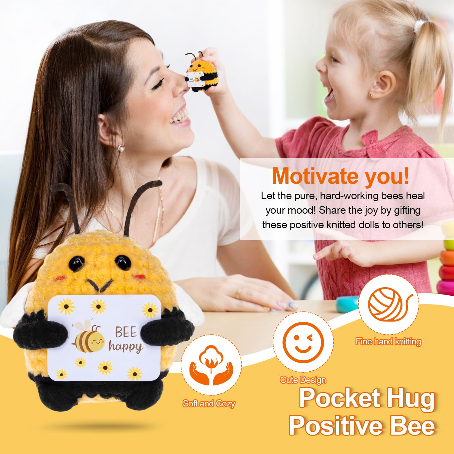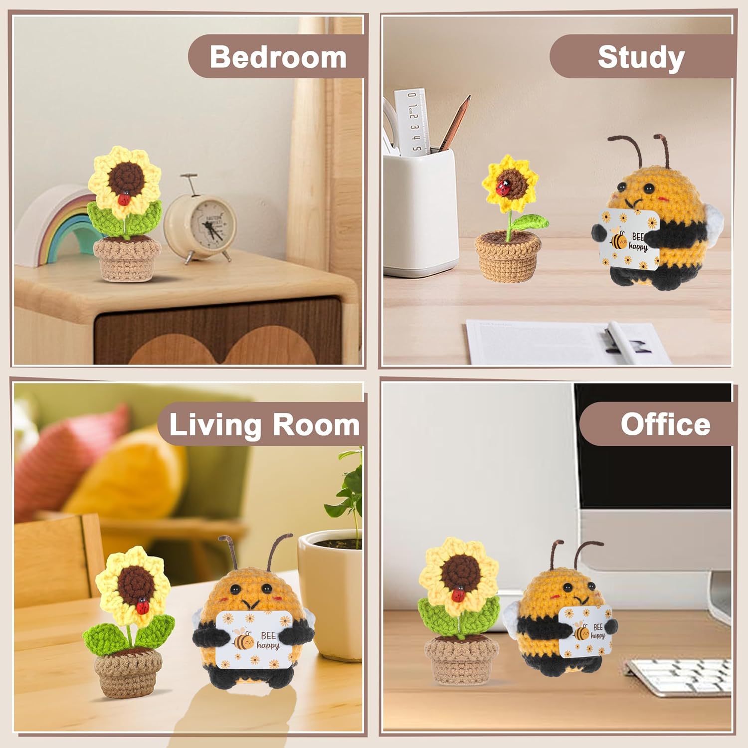 Einfach niedlich! Dieses Bee Happy Set von YceLon bringt Sommerstimmung in dein Zuhause. Zwei handgehäkelte Kuscheltiere: eine süße Biene und ein sonniger Sonnenblumentopf. \\n\\nHergestellt aus hochwertigem Wollgarn für weiche, kuschelige Textur. Jedes Stück ist ein Unikat mit liebevollen Details - absolute Handarbeit! \\n\\nPerfekt fürs Wohnzimmer, Büro oder als besonderes Geschenk für Freunde und Familie. Die fröhlichen Farben heben sofort die Stimmung und verbreiten positive Energie. \\n\\nDie Biene symbolisiert Glück und Fleiß, die Sonnenblume steht für Lebensfreude und Wärme. Zusammen ein perfektes Geschenk für jeden Anlass! \\n\\nRobuste Verarbeitung - keine Formveränderung, kein Ausbleichen. Mehr als nur Deko: emotionale Unterstützung und Trost in stressigen Zeiten. Einfach glücklich machen!