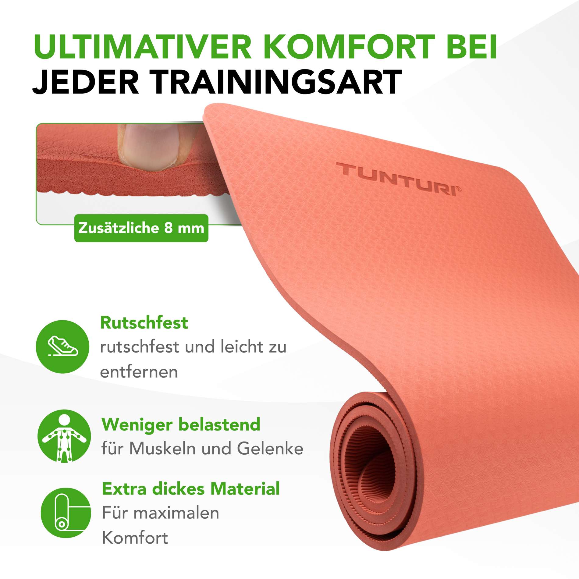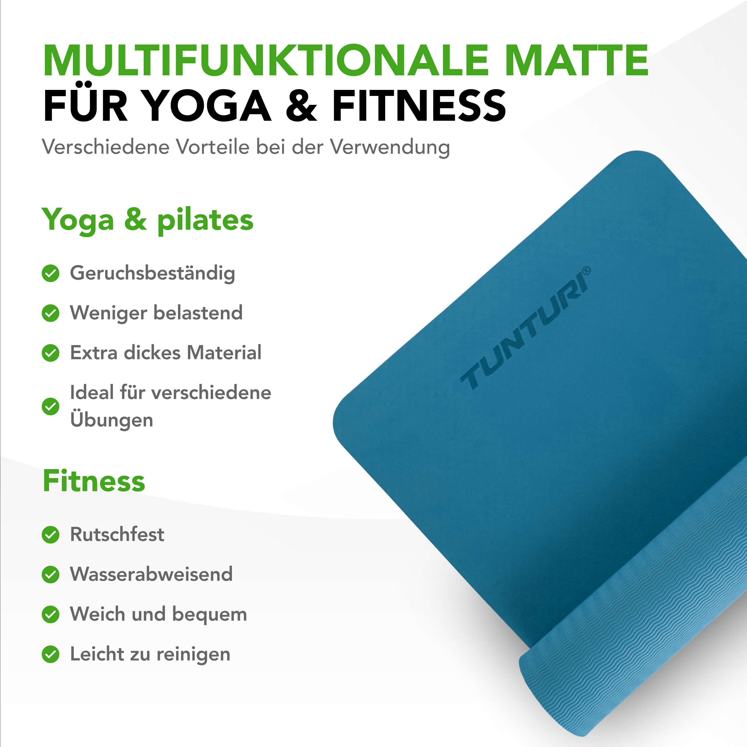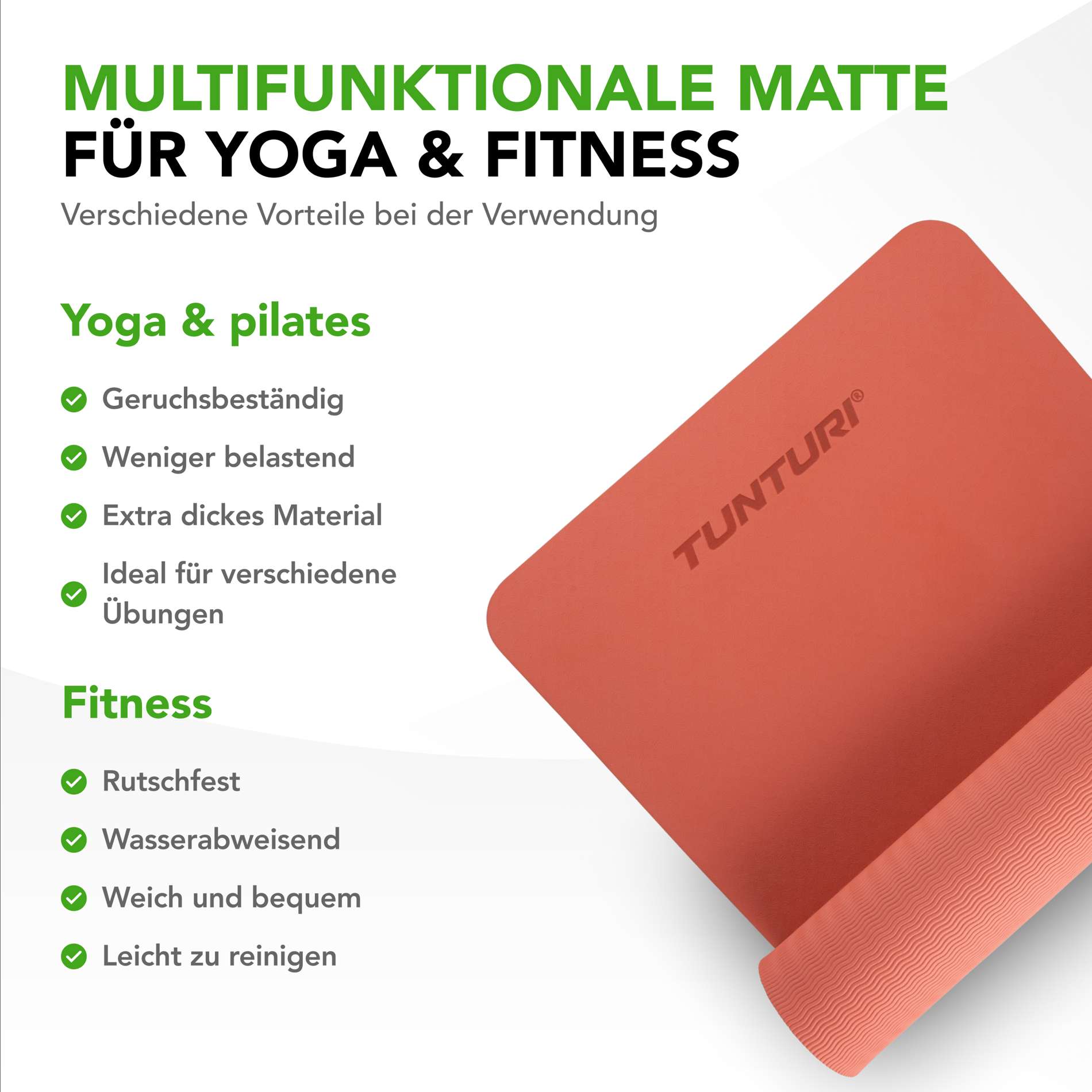 Perfekt für dein tägliches Training! Diese Yoga-Matte ist mit 173x61cm groß genug für alle Übungen und mit 0,4cm Dicke schön gepolstert für deine Knie und Ellbogen. Das angenehme Material gibt dir genug Grip, ohne zu rutschen - super für Yoga, Pilates oder Fitness-Übungen zu Hause. Der praktische Baumwoll-Tragegurt macht sie super transportabel: Einfach zusammenrollen und über die Schulter hängen, schon kannst du sie überall mit hinnehmen. Ob im Wohnzimmer, Garten oder im Fitnessstudio - diese Matte ist immer dabei! Die Gummibänder sind perfekt für zusätzliche Übungen oder zum Dehnen. Reinigen geht easy: Einfach mit einem feuchten Tuch abwischen und fertig. Sie nimmt kaum Platz weg und sieht dabei noch gut aus. Egal ob du Anfänger oder Profi bist - mit dieser Matte machst du nichts falsch. Dein perfekter Begleiter für mehr Entspannung und Fitness im Alltag!