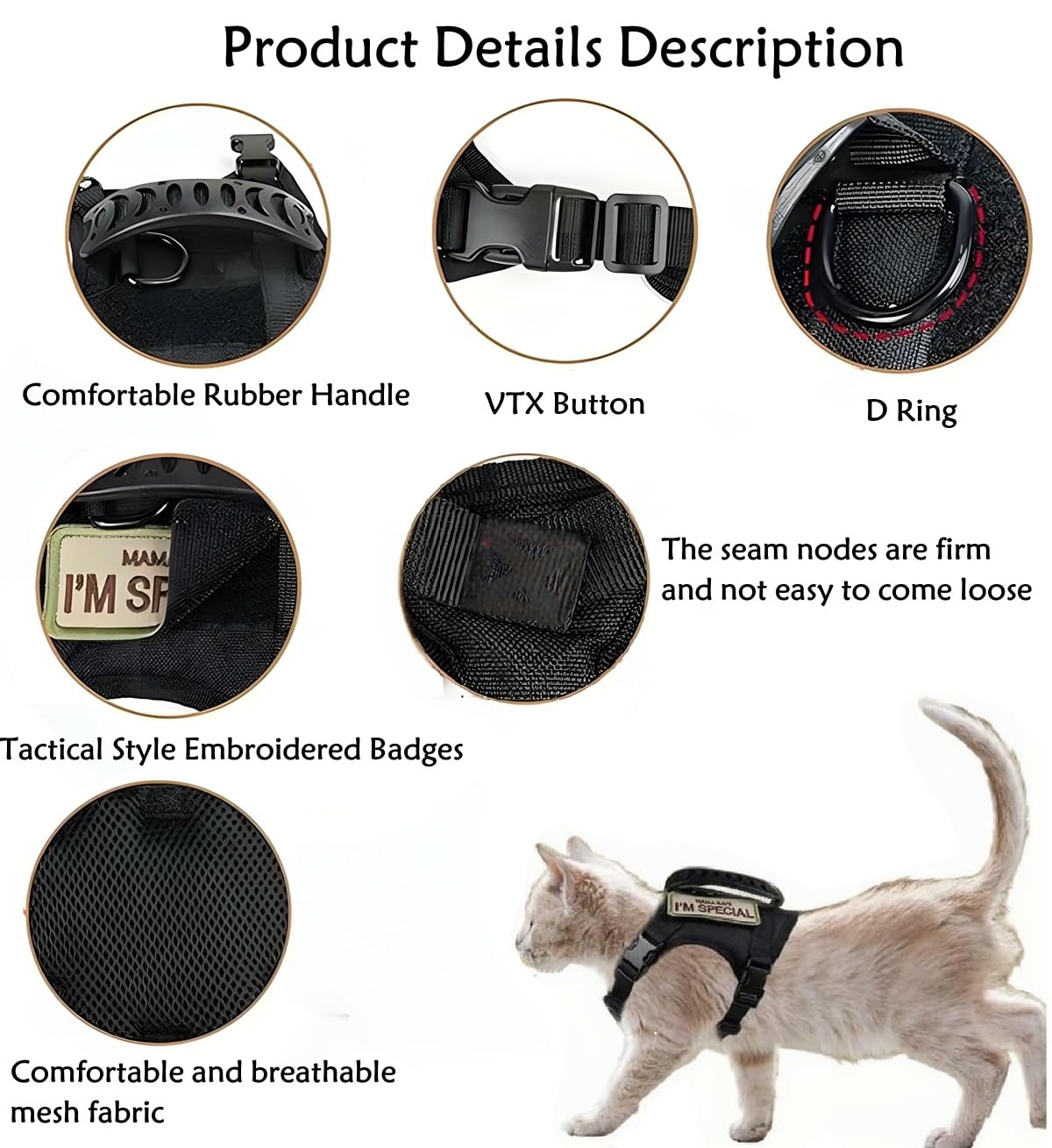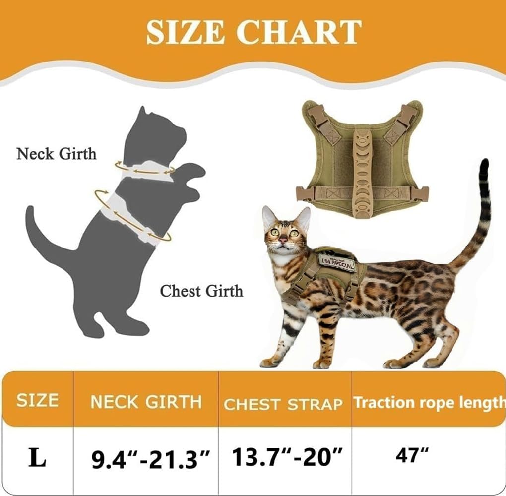 Deine Katze liebt Abenteuer, aber du hast Angst, dass sie wegläuft? Dieses taktische Geschirr von ZHHSUNY ist die Lösung! Es ist aus robustem 900D-Nylon gefertigt, atmungsaktiv und durch 4 Schnellverschlussschnallen voll verstellbar. Der Halsumfang lässt sich von 9,4 bis 21,3 Zoll anpassen, der Brustumfang von 13,7 bis 20 Zoll – also ideal für die meisten adulten Katzen. Der Gummigriff auf dem Rücken gibt dir die Kontrolle in kniffligen Situationen, und das reflektierende Zugband sorgt für Sichtbarkeit bei Dunkelheit. Plus: Zwei personalisierte Stickabzeichen sind im Lieferumfang enthalten! So wird dein Stubentiger zum stylischen Outdoor-Profi. Einfach anziehen, Leine dran, und los geht's – sicher und bequem für beide.