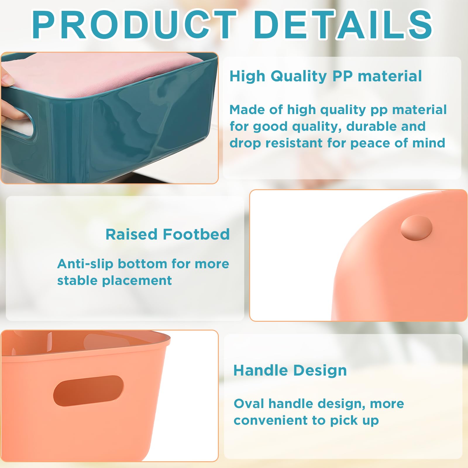 Endlich Ordnung im Chaos! Dieses 12-teilige Set mit bunten Aufbewahrungskörben bringt System in deine Küche, Bad oder Schlafzimmer. In 6 fröhlichen Farben (Blau, Orange, Weiß, Grau, Beige, Grün) und zwei praktischen Größen: 24,5x17x10cm und 20,5x14x7,3cm. Aus stabilem PP-Material, das wasser- und feuchtigkeitsbeständig ist - perfekt auch fürs Badezimmer! Die praktischen Griffe machen das Tragen leicht, und weil sie stapelbar sind, sparst du jede Menge Platz. Jede Box trägt bis zu 30kg! Super für Snacks, Make-up, Putzmittel, Spielzeug oder Bürobedarf. Mach aus unordentlichen Schränken ordentliche Aufbewahrungsparadiese. Einfach sortieren, stapeln und sich über die neu gewonnene Ordnung freuen!