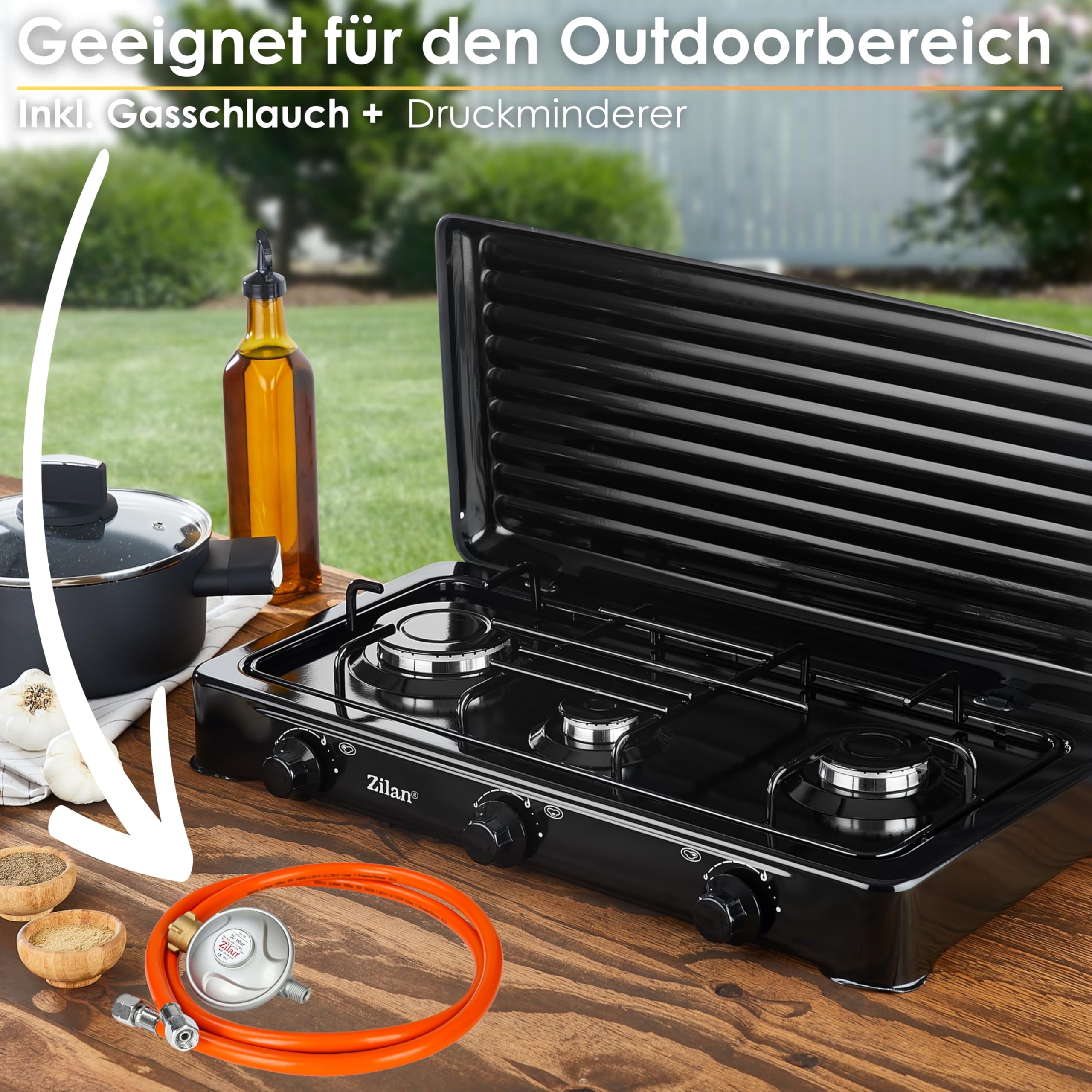 Der perfekte Begleiter für Outdoor-Abenteuer! Dieser ZMC 3-Flammen Gaskocher bringt Profi-Küche ins Freie. Mit zwei starken 2,2kW Hauptbrennern und einem zusätzlichen 1,0kW Brenner meisterst du jedes Gericht - ob schneller Kaffee oder aufwändiges Menü. Bei nur 393g/h Verbrauch und 5,4kW Gesamtleistung ist er effizient und kraftvoll zugleich. Kompakt mit 60x32x10cm, leicht (4,7kg) und mit abnehmbarem Windschutz. Einfache Bedienung mit 2-Stufen-Regulierung pro Brenner. Robust emailliert, kratzfest und leicht zu reinigen. Inklusive Gasschlauch und 50mBar Regler für Propangas. Perfekt für Camping, Garten, Picknick oder Notfallküche. Einfach anschließen und loskochen - dein Outdoor-Kocherlebnis kann beginnen!