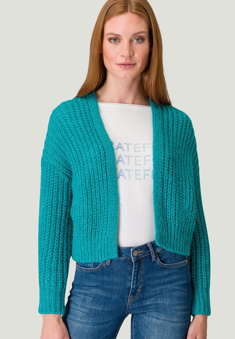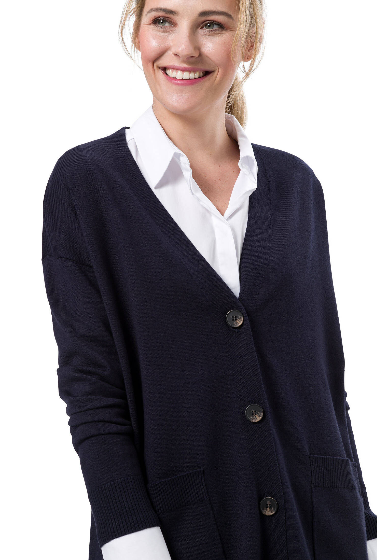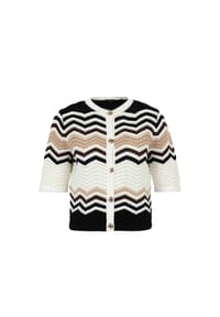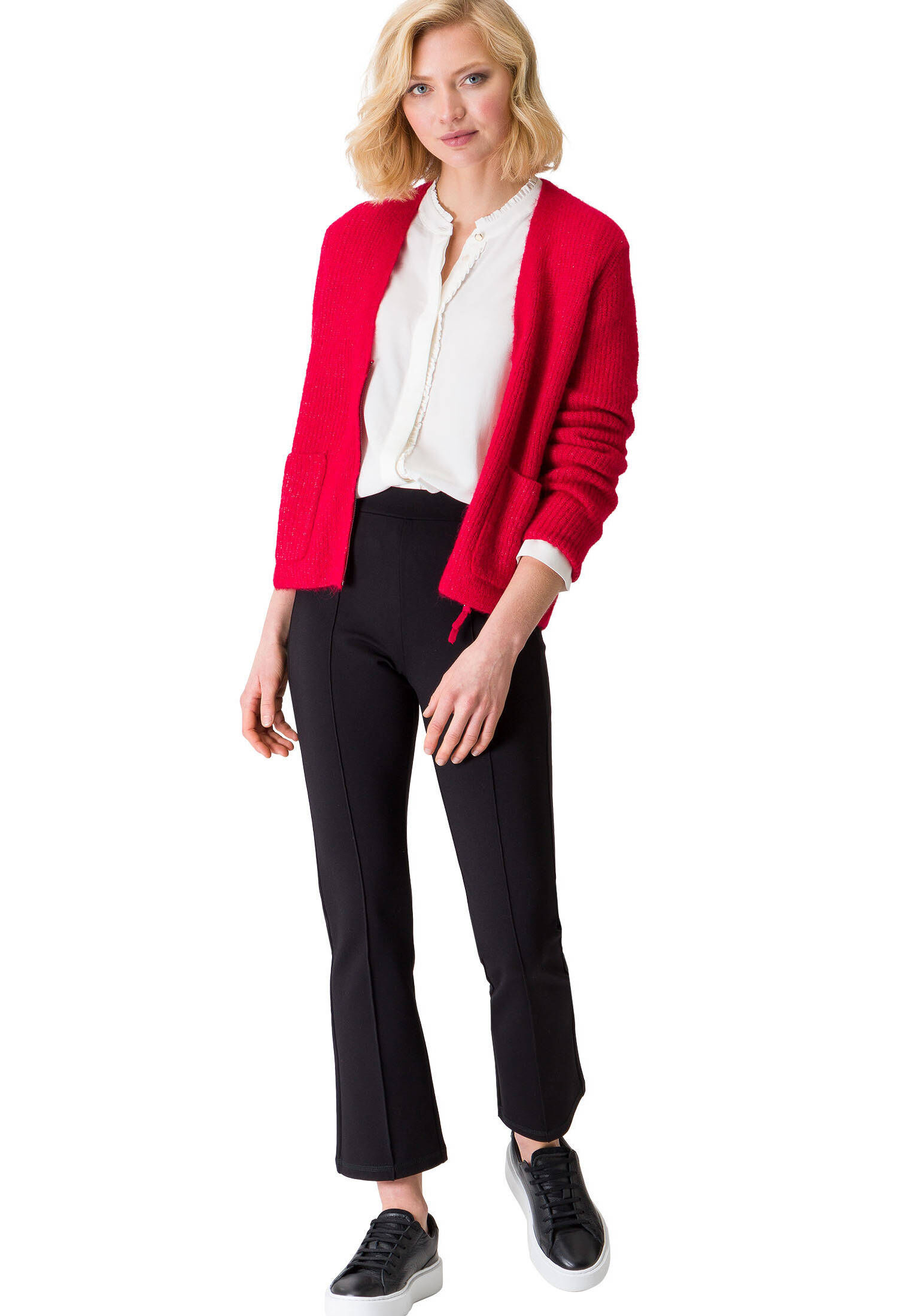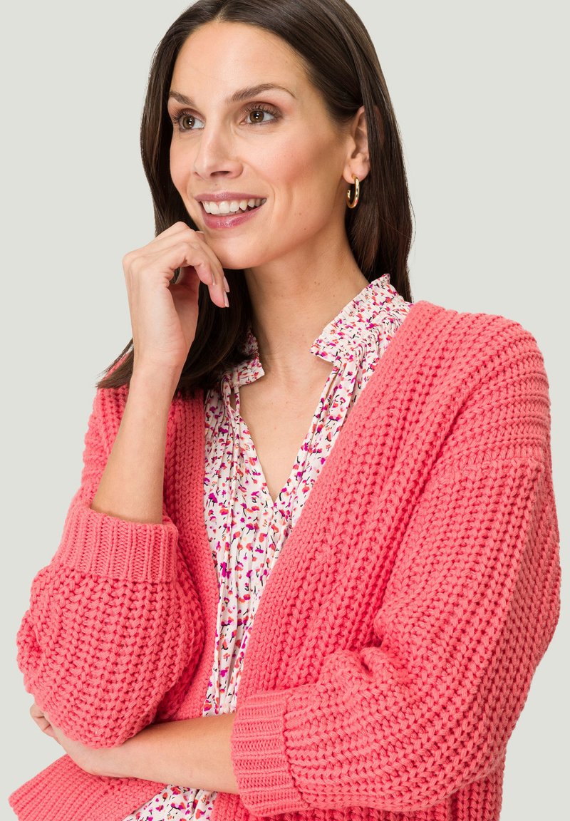 Diese zero Strickjacke mit süßen Rüschen ist der perfekte Begleiter für kühlere Tage! Die figurbetonte Passform betont deine Silhouette, während die weiche Strickqualität für maximalen Komfort sorgt. Mit Knopfleiste, Langarm und Rundhals-Ausschnitt.