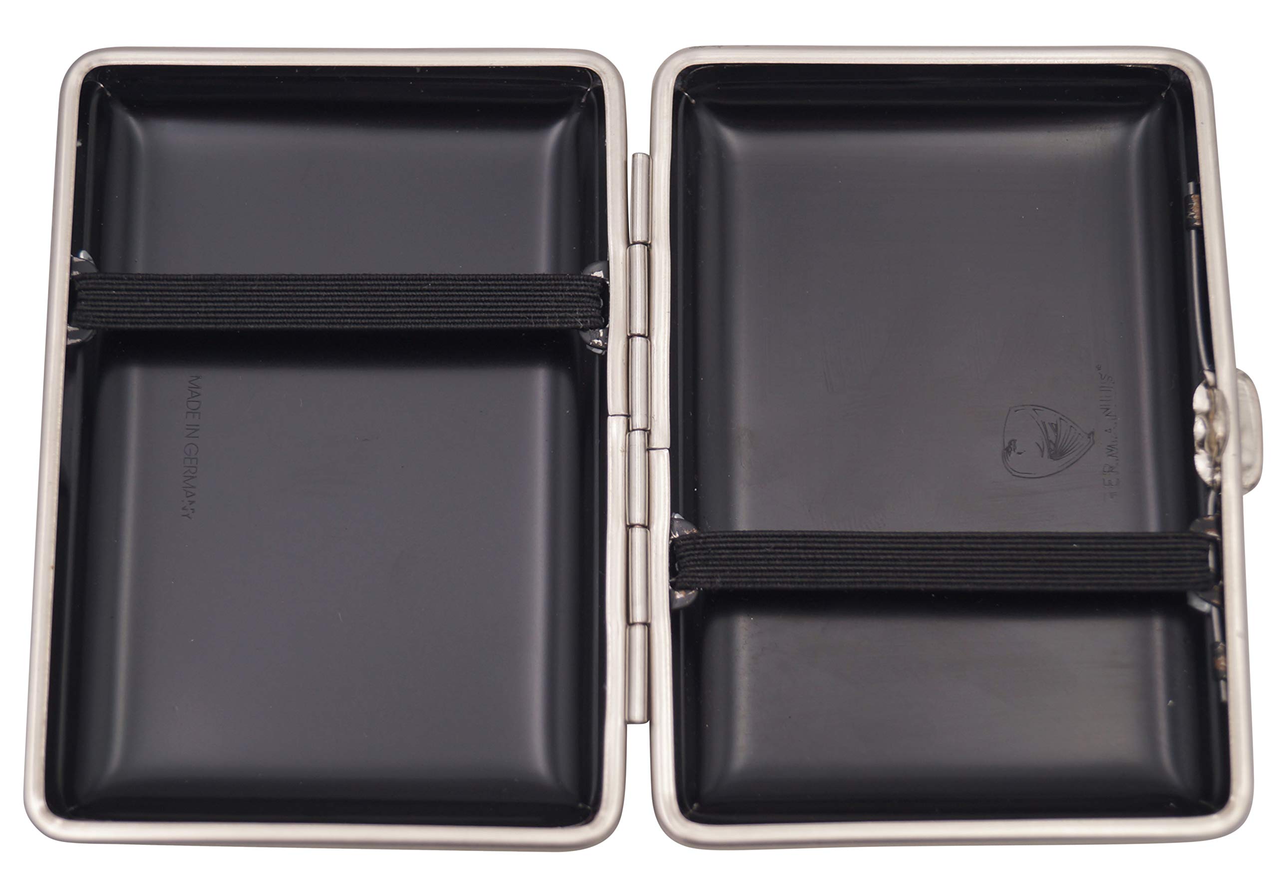 Dieses Zigarettenetui ist ein echter Klassiker - seit 1912 wird es in Deutschland in Handarbeit gefertigt! Aus 100% Echtleder in Braun, mit edlem Hochglanznickel-Rahmen. Passt perfekt für 18 Zigaretten à 85 mm. Das Leder entwickelt mit der Zeit eine individuelle Patina - jedes Etui wird so zum Unikat. Mit stabilem Klickverschluss und Gummizug innen. Maße: ca. 100x84x19 mm. Schützt deine Zigaretten vor Knicken und Feuchtigkeit. Ein Accessoire mit Tradition und Stil!