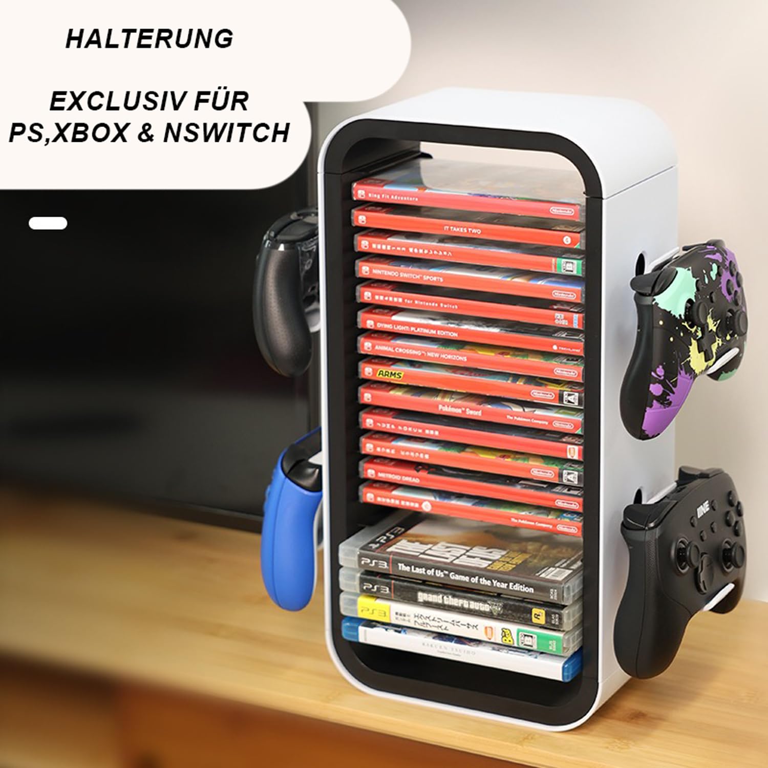 Endlich Ordnung im Gaming-Bereich! Dieser Aufbewahrungsturm bietet Platz für 18 Spielehüllen und hat an den Seiten Haken für 4 Controller. Kompatibel mit PS5, PS4, Xbox One, Series S/X und Switch - also perfekt für Multi-Konsolen-Besitzer. Aus robustem ABS-Kunststoff, schnell in unter 2 Minuten montiert, ohne Werkzeug. Sieht stylisch aus und hält deine wertvolle Sammlung sicher und organisiert. Kein langes Suchen mehr - alles griffbereit an einem Platz. Ein absolutes Must-have für jeden ernsthaften Gamer!
