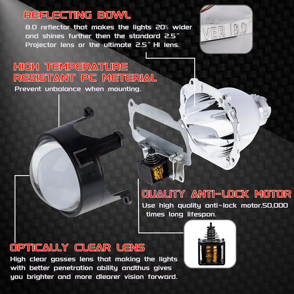 Upgrade deine Scheinwerfer mit diesen professionellen BI-XENON Projektor Linsen! Das 2er-Set mit 2,5 Zoll Glaslinsen verwandelt deine Standard-Scheinwerfer in hochwertige Projektor-Einheiten. BI-XENON Technologie bietet sowohl Fern- als auch Abblendlicht in einer Linse. Die klare Schnittlinie blendet entgegenkommende Fahrer nicht - mehr Sicherheit bei Nacht. Komplett aus Metall für maximale Haltbarkeit, mit silberner Shroud-Abdeckung für stylisches Aussehen. Kompatibel mit H1 Xenon Leuchtmitteln und passt in H4/H7 Scheinwerfer. Einfache Installation - designed für perfekte Passform in den meisten Fahrzeugen. LHD Version für Linksverkehr. Ob für Auto oder Motorrad - diese Linsen geben dir professionelle Lichtleistung zum kleinen Preis. Mach deine Nachtfahrten sicherer und stylischer!