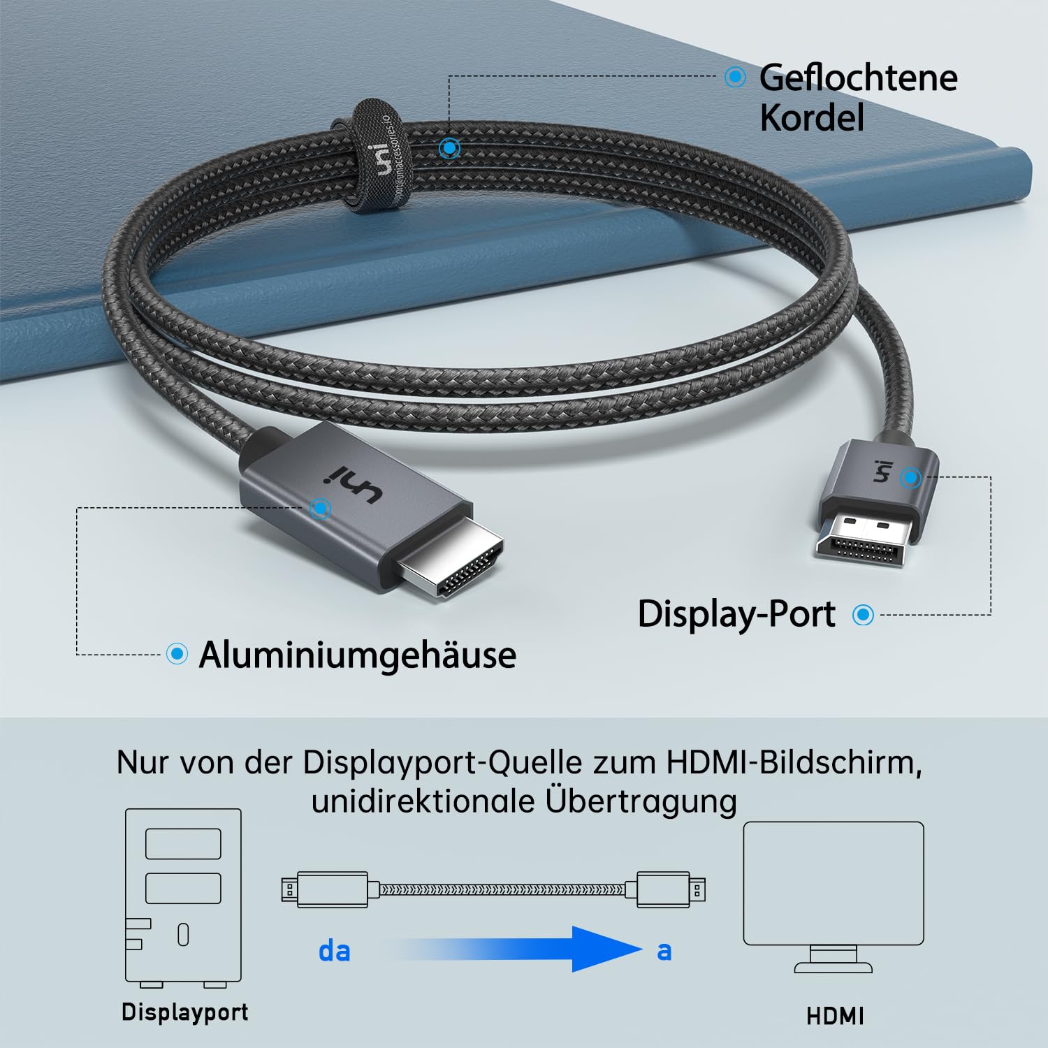 Uni DisplayPort Zu HDMI Kabel 4K 2m - Geflochtenes Nylon Kabel Für Monitor & TV | 3840x2160 @30Hz