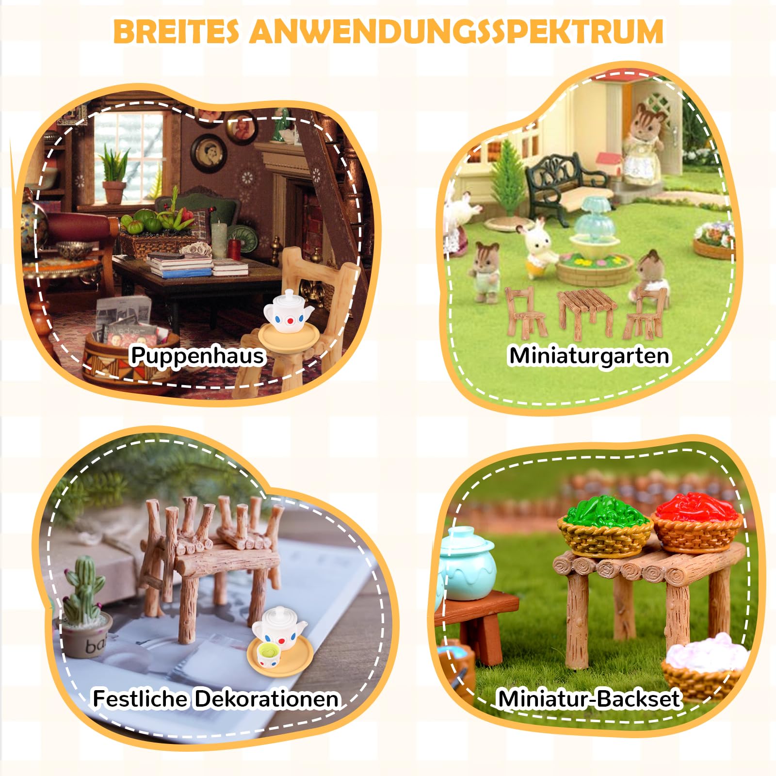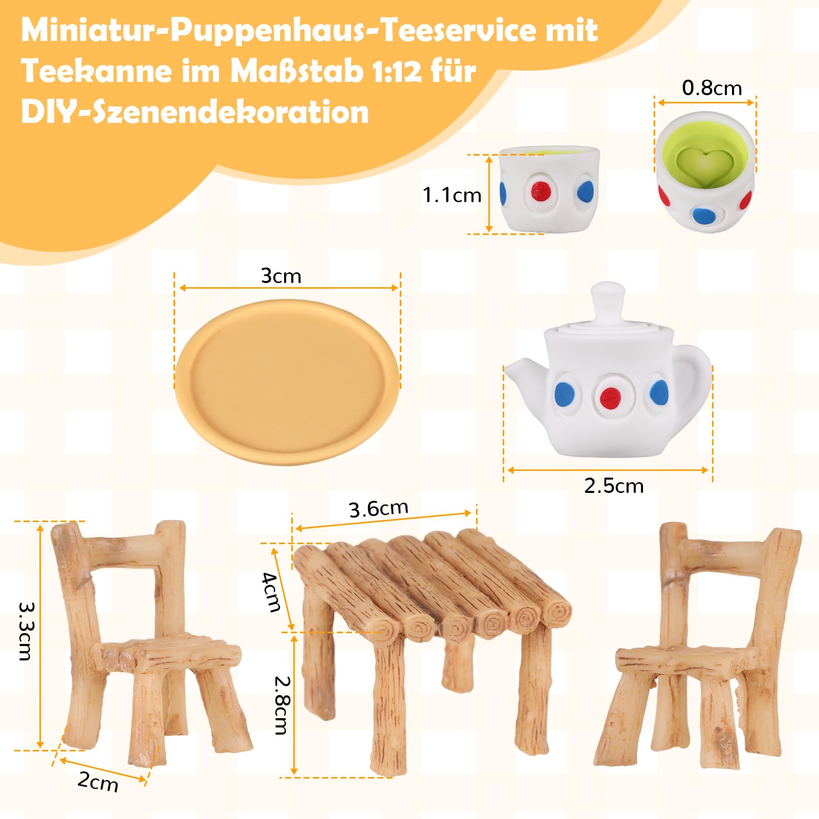 Zaubern Sie eine winzige Wohlfühlwelt! Dieses 20-teilige Puppenhaus-Set verwandelt jedes Puppenhaus in eine gemütliche Miniatur-Küche. Enthalten sind: 2 Stühle, 1 Tisch, 1 Tablett, 2 Milchbecher, 1 Wasserkocher, 1 Nudelholz, 1 Mixer, 1 Mehlbeutel, 1 Olivenöl-Flasche, 1 Eierkorb, 6 Eier, 1 gebrochenes Ei und 1 Schüssel. Aus natürlichem Holz und Harz - sicher für Kinder und langlebig. Im Maßstab 1:12 und 1:6 perfekt für die meisten Puppenhäuser. Super realistisch - die Mini-Lebensmittel sehen täuschend echt aus! Perfekt für Rollenspiele mit Kindern, fördert Kreativität und Fantasie. Auch toll für Feengärten, Dioramen oder als Sammlerstück. Ein wunderbares Geschenk für kleine und große Puppenhaus-Fans - Spielspaß und kreative Gestaltung in einem!