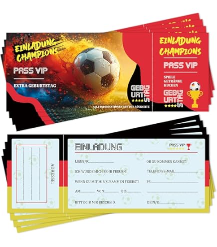Achtung, Tor! Diese Einladungskarten sind perfekt für die siebte Geburtstagsfeier deines kleinen Fußballfans. Im praktischen 12er-Set hast du genug Karten für die ganze Mannschaft. Im A6 Format (10,5 x 14,8 cm) sind sie schön handlich aber trotzdem groß genug für alle Infos. Die stabilen Karten mit 300g/m² Bilderdruck und UV-Lack sind robust und schmutzabweisend - ideal für Kinderhände! Auf der Rückseite findest du vorgedruckte Felder für alle wichtigen Daten: Wann, Wo, Telefonnummer und sogar ein Extra-Feld für besondere Hinweise. Ob Verkleidungsparty oder Wunschliste - hier ist Platz für alles. Hergestellt in Deutschland in erstklassiger Qualität. Mit dem coolen Fußball-Design kommt garantiert Stimmung auf! Einfach ausfüllen, verteilen und sich auf eine super Geburtstagsparty freuen. Auch als Erinnerung an den großen Tag sind die Karten später noch schön.