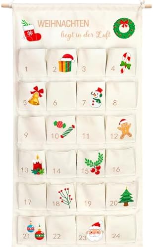 Die Vorfreude auf Weihnachten wird mit diesem tollen Adventskalender aus Stoff noch schöner! Mit 24 praktischen Taschen (je 11x11cm) kannst du ihn Jahr für Jahr neu befüllen. Aus Baumwolle und Leinen gefertigt, ist er robust und waschbar. Einfach an die Wand hängen und mit Süßigkeiten, kleinen Geschenken oder lieben Nachrichten füllen. Die Zahlen 1-24 sind schon aufgedruckt - super praktisch! Perfekt für Kinderzimmer, Wohnzimmer oder Büro. Mach die Weihnachtszeit zu etwas Besonderem für deine Liebsten. Ein nachhaltiger Kalender, der viele Jahre Freude bringt - viel schöner als die Wegwerf-Varianten!