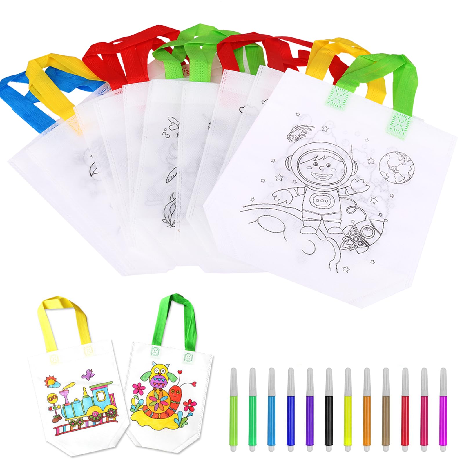 Kreativität pur für kleine Künstler! Dieses 16-teilige Set mit Stoffbeuteln und 10 stapelbaren Wachsmalstiften lässt Kinderaugen leuchten. Jeder Beutel hat ein anderes Motiv - da wird's nie langweilig! Aus weichem Vliesstoff gefertigt, wasserabweisend und ohne unangenehmen Geruch.\n\nMit 28x32cm perfekt für Spielzeug, Süßigkeiten oder als Geschenktüten. Die stapelbaren Stifte in 12 Farben machen doppelt Spaß und fördern die Feinmotorik. Ideal für Kindergeburtstage, Kindergarten oder einfach für einen verregneten Nachmittag zu Hause.\n\nOb für Halloween, Weihnachten oder Mottopartys - diese Beutel sind immer die richtige Wahl. Deine Kinder können ihrer Fantasie freien Lauf lassen und ganz nebenbei Konzentration und Kreativität trainieren. Einfach super!