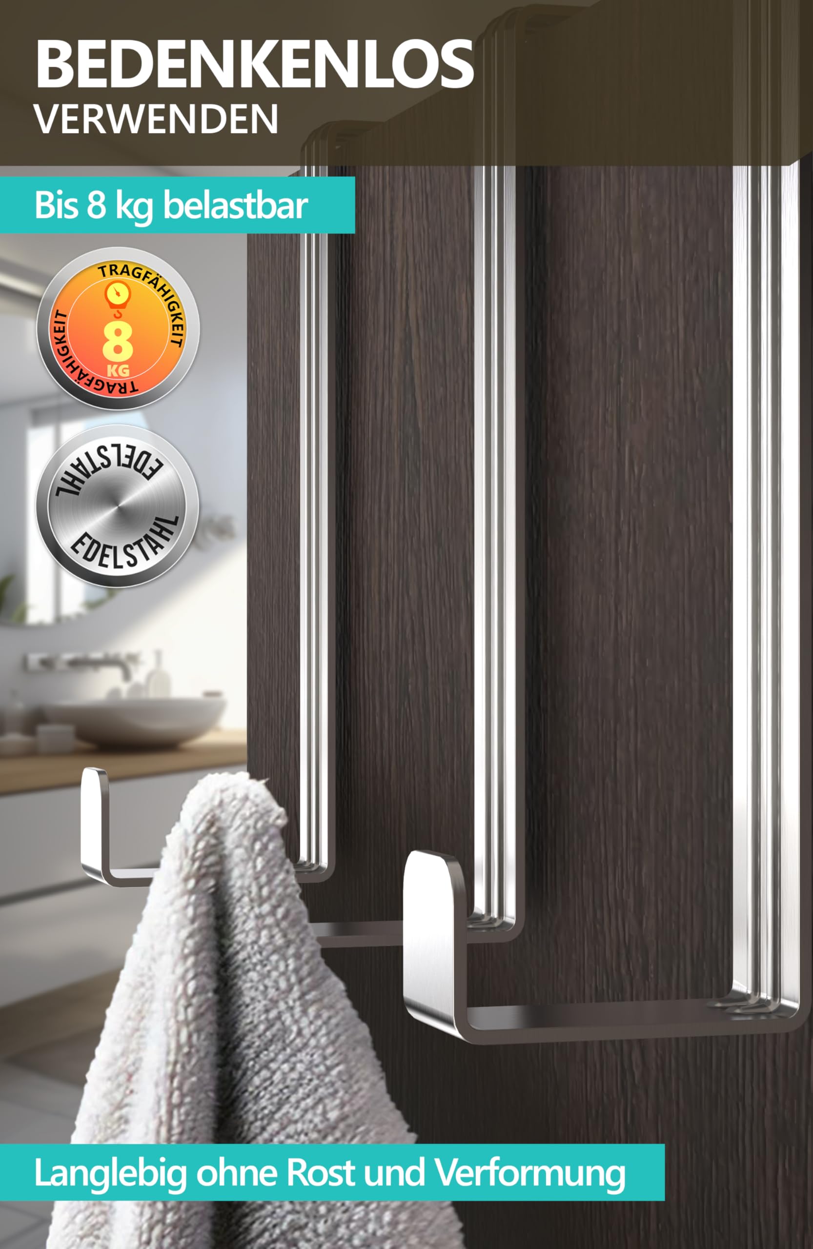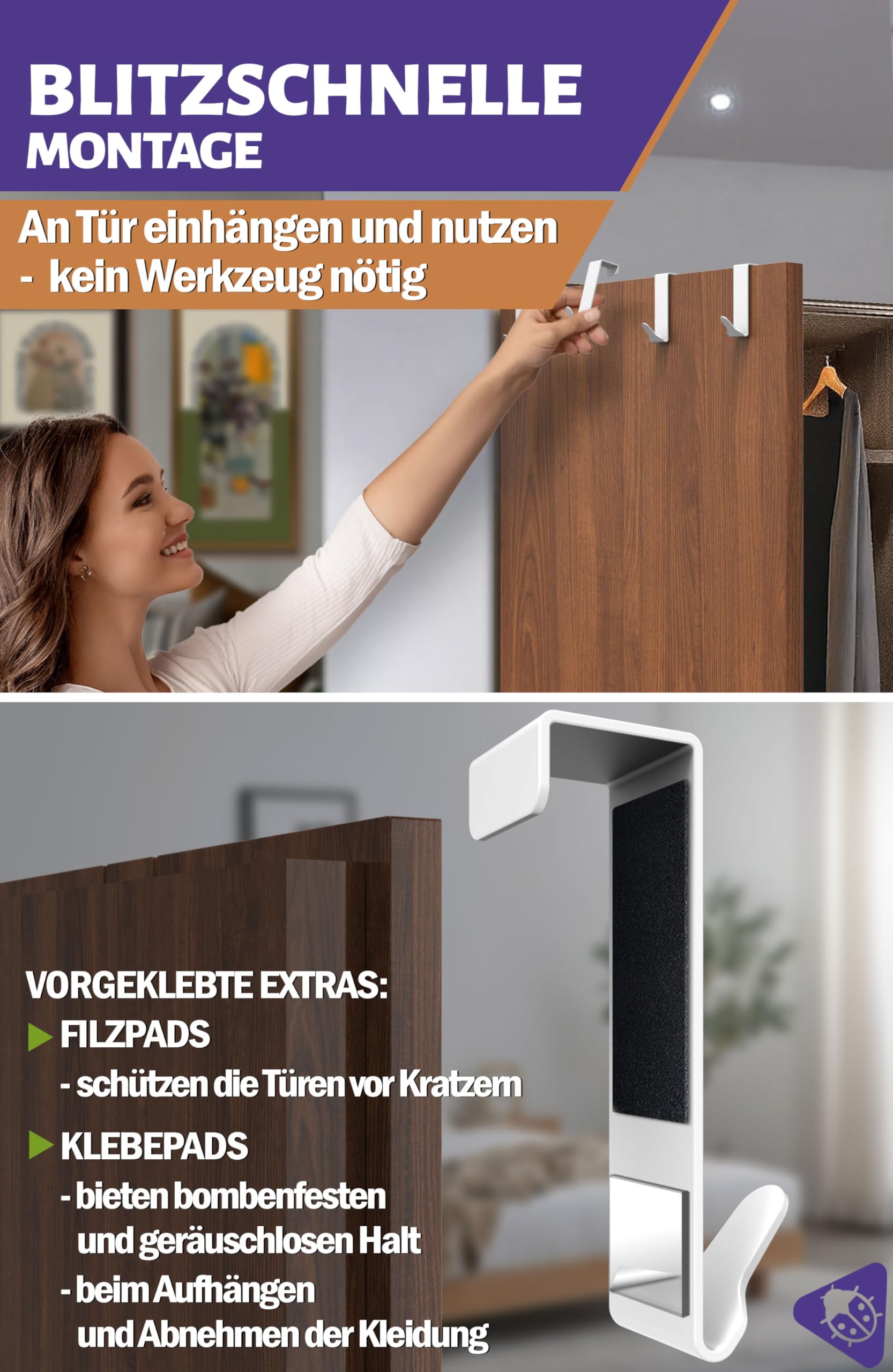 Mehr Stauraum an der Tür! Diese 6 weißen Türhaken verwandeln jede Zimmertür in eine praktische Garderobe. 🚪\n\n• 6 Türhaken in reinweiß - dezent und funktional\n• Einfach über die Tür gehängt - keine Montage nötig\n• 2 Falztiefen passen für fast alle deutschen Türen\n• Tragkraft bis 8kg pro Haken - stabil und sicher\n• Mit Filzpads zum Türschutz und Klebepads gegen Rutschen\n\nPerfekt für Flur, Bad, Kinderzimmer oder Schlafzimmer. Ob Jacken, Handtücher, Taschen oder Gürtel - hier findet alles Platz. Die Türen schließen weiterhin einwandfrei und durch die Filzunterlage gibt's keine Kratzer. So einfach kann Ordnung sein! 👕