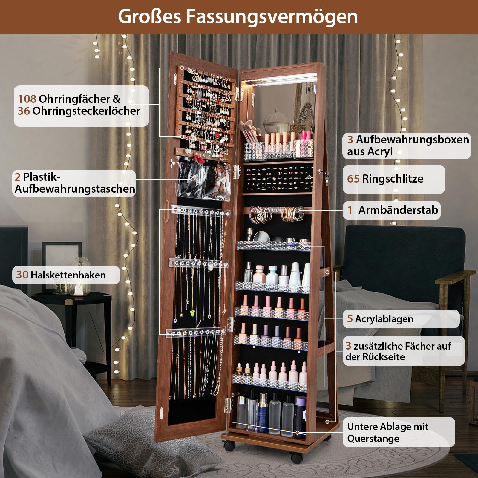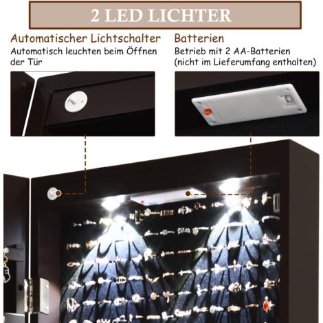 Endlich Ordnung im Schmuckkästchen! Dieser tolle Schmuckschrank bietet Platz für deine gesamte Schmucksammlung. Mit 120 Ohrringschlitzen, 36 Ohrringlöchern, 84 Ringschlitzen, 18 Haken, 1 Armbandstange, 4 Ablageflächen und 6 Schubladen findet alles seinen Platz. Das beste Feature: 5 automatische LED-Leuchten, die aufleuchten sobald du die Tür öffnest - perfekt um deinen Schmuck schnell zu finden! Aus hochwertigem MDF mit weichem Samtfutter schützt er deine Schätze vor Kratzern. Die abschließbare Tür hält neugierige Kinderhände fern. Du kannst ihn entweder an der Wand befestigen oder einfach über die Tür hängen. Mit dem integrierten Spiegel kannst du dich direkt vor dem Schrank schmücken. Ein echter Hingucker für jedes Zimmer!